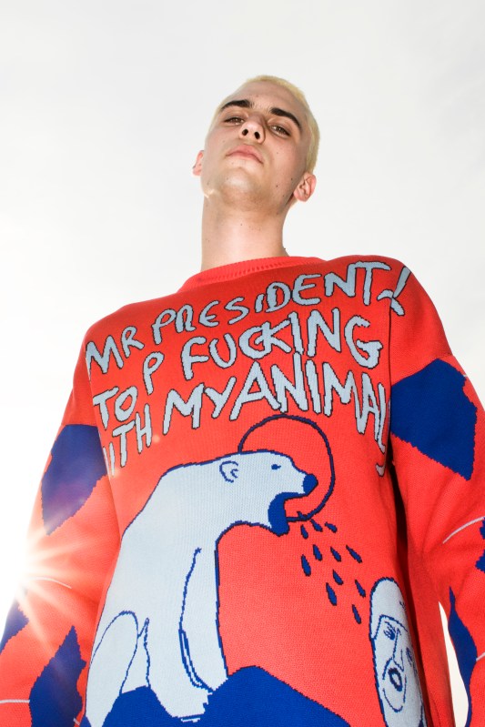 Anna created ”STOP F*UCKING WITH MY PLANET” collection as a political statement against our favorite orange man. The collection is reminiscent of 1980’s London. Anna Dorian is a self proclaimed 16 year old that was born in Venice but is now residing in Zurich. Check out her collection below: