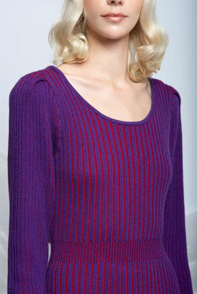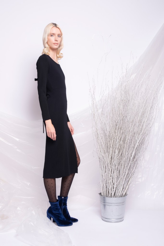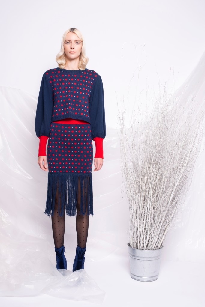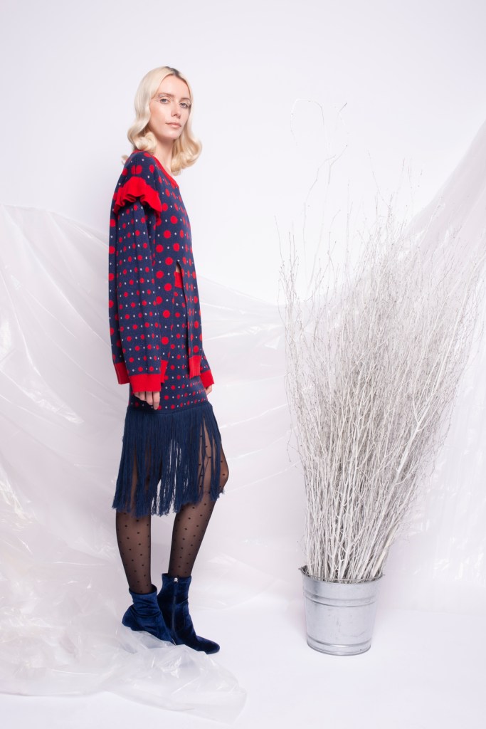 Yun Qu’s passion for fashion is matched only by her enduring love of music. A trained musician, she plays piano, electric guitar and drums, and whilst in High School played in a rock band. While her earlier AW2019 collection, “Enigma”, explored the music and fashion possibilities of a 21st century grunge, her AW2021 collection set it sights on the interwar Parisian jazz scene. Considering the fusion of music and fashion Yun reimagines the expressive, elegant a bold outfits worn by the Parisian women of the Années Folles. Women like dancer Josephine Baker, who would spend her days drinking coffee in Montmartre, and her nights dancing at the Folies-Bergere. Yun captures the sense of movement and emotion evoked by jazz; from the up-tempo heart thumping thrills to the low-tempo graceful sway. Using metallic colours, exaggerated sleeves, fringing and frills, Yun has created pieces that evoke the artistry and sculptural elegance of the period whilst feeling thoroughly modern. Puff sleeves, patterned knitwear, bows, polka dots and harlequin prints are all drawn into the maelstrom of Yun’s reimagined Parisian Jazz scene. A structured lace bodice dress grants the wearer the musical sensuality of the era, while a knitted dress underscores the feminine freedoms rediscovered in the 1920s. Yun’s expansive silhouettes are matched only by her broad palette of textures and materials. Coloured metallics mirror the Parisian avant-garde’s fascination with the machine age, exaggerated frills conjure a vision of the bustling cabaret and knitwear reinforces the era’s shift away from restrictive corsets and unruly crinolines.