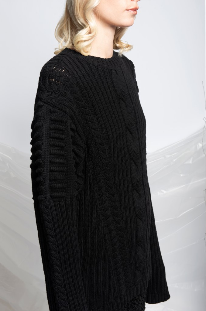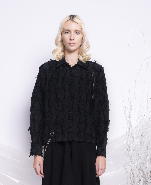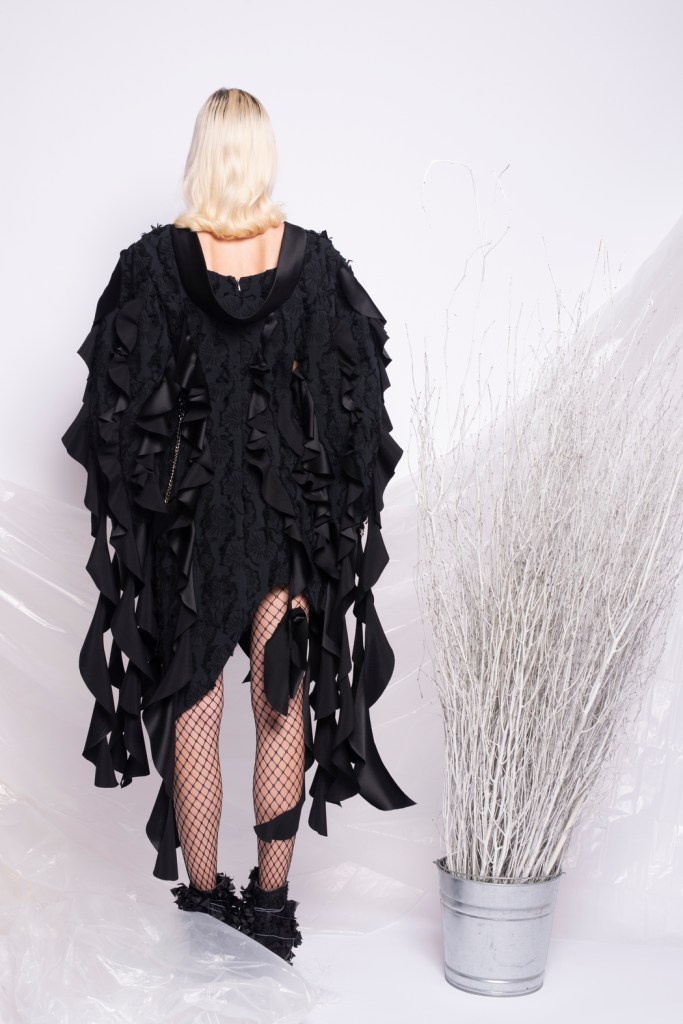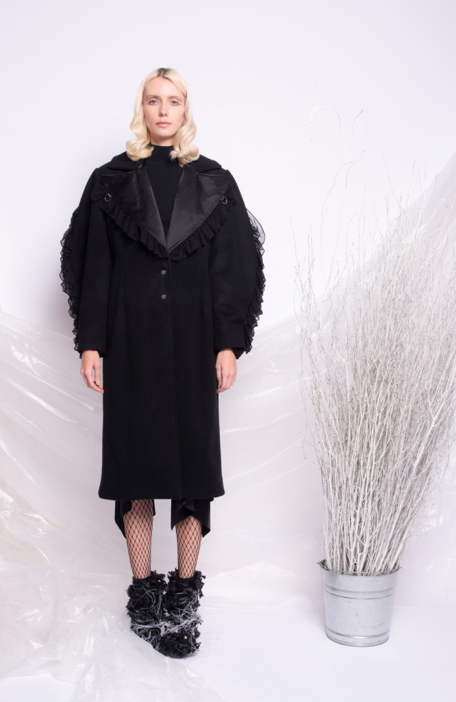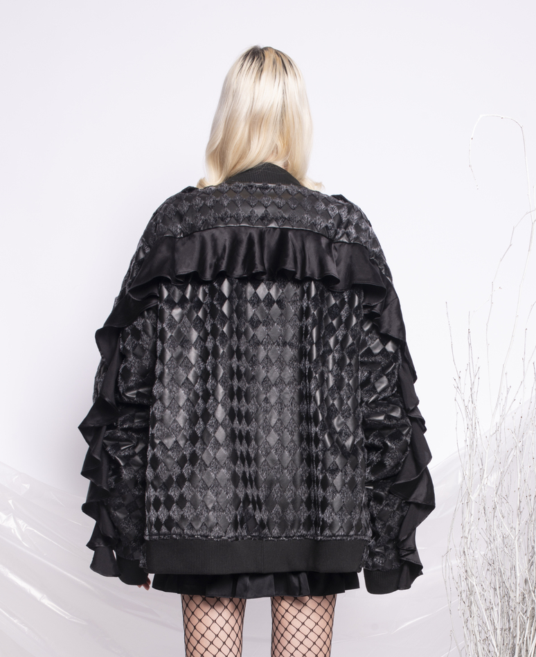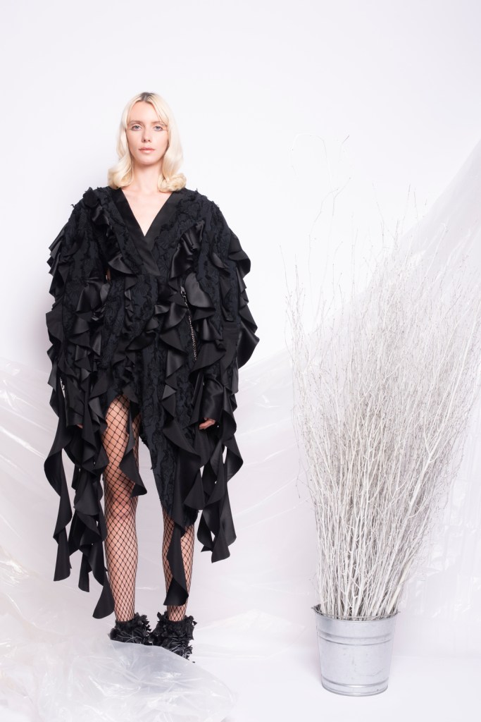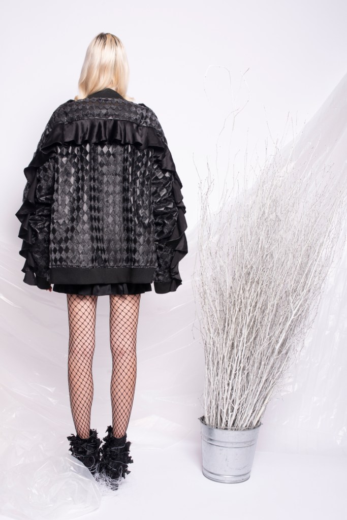 The black Multi ruffled cropped jacket. It was handmade in my studio in New York. We only made a couple of pieces and it was sold out in the store. We might be producing the same jacket again with different materials in the future.