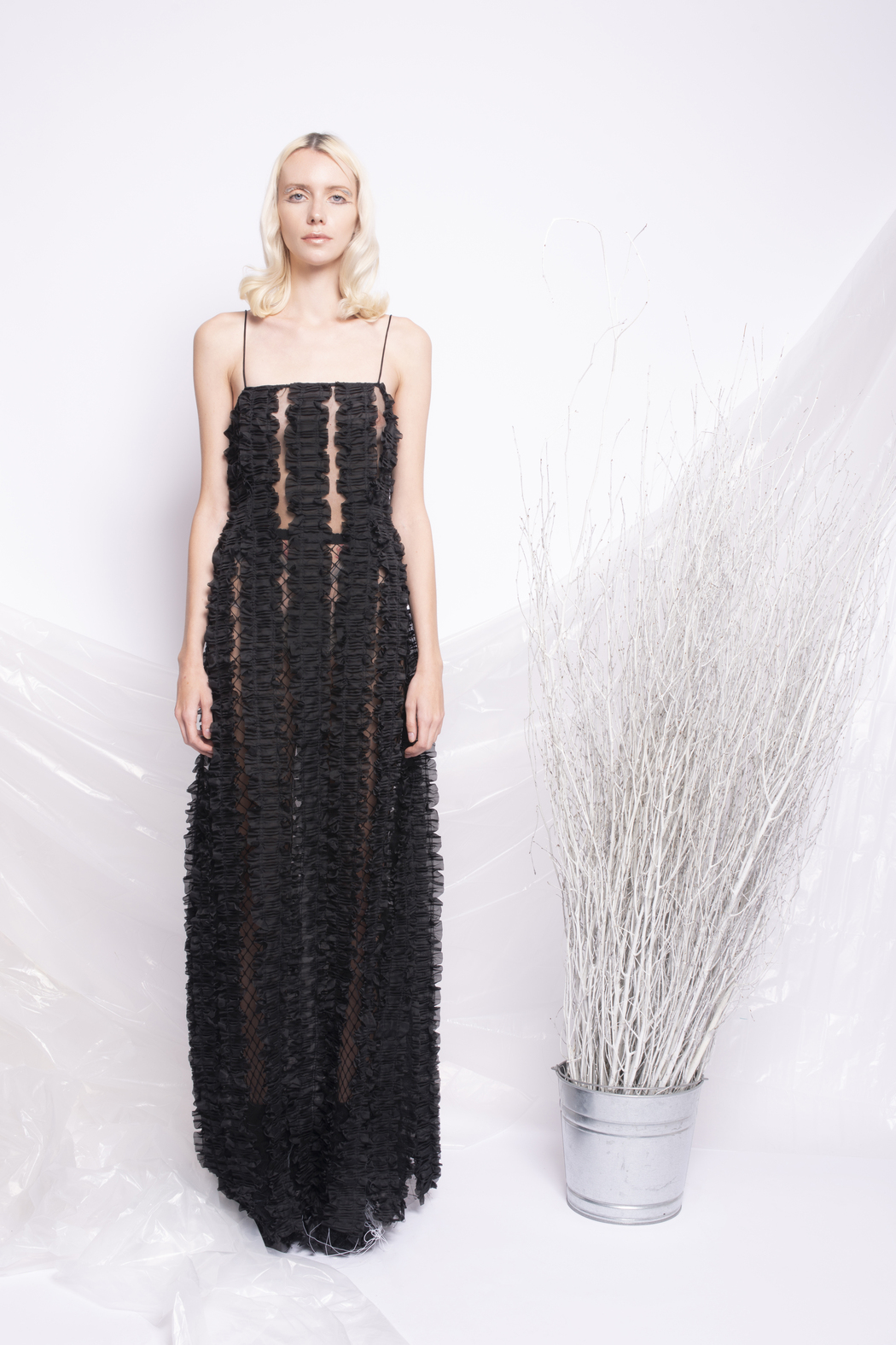 The black Multi ruffled cropped jacket. It was handmade in my studio in New York. We only made a couple of pieces and it was sold out in the store. We might be producing the same jacket again with different materials in the future.