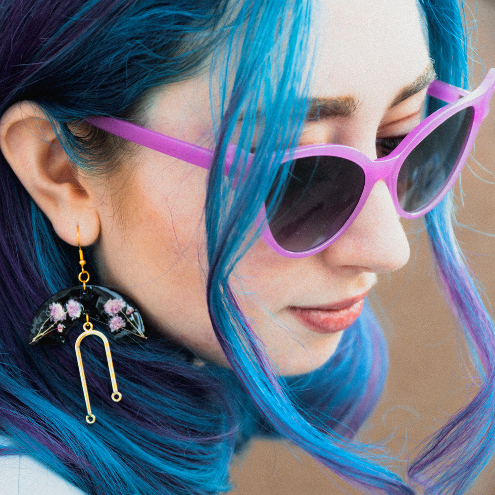 The designer begins by mixing together various types of polymer clay to create a sturdy base. Then she adds various pigments together to make a desired color before cutting them into shape. From there, she bakes the batch until it becomes sturdy yet bendable. Once cooled, the clay goes through a process of sanding, buffing, coating, and drilling before adding brass or pressed plant accents. There are also certain pairs of earrings I paint specific designs over and apply gold flakes and a resin finish. Since these are created by hand and at home it may include some beautiful imperfections, but we love imperfections!