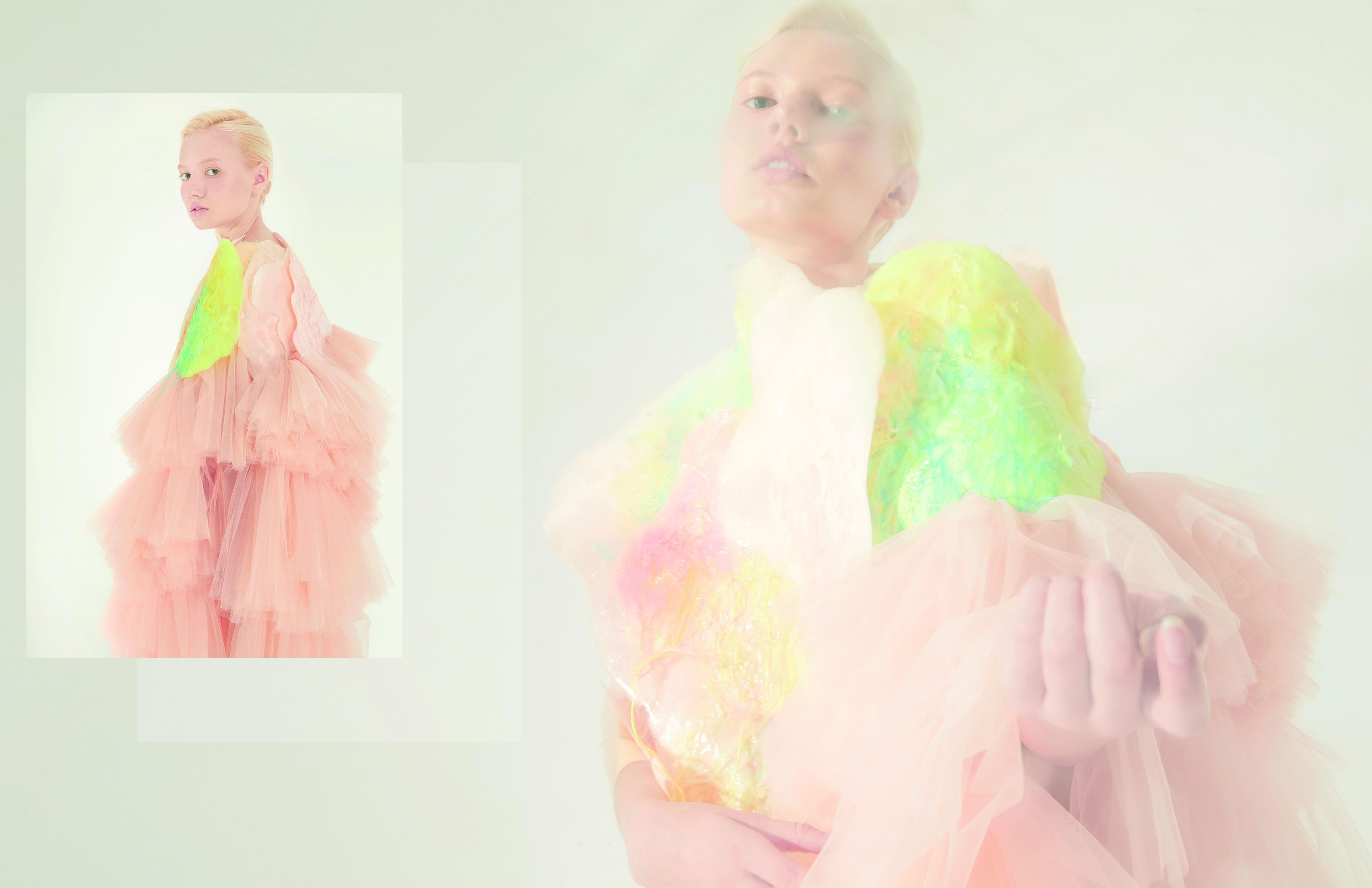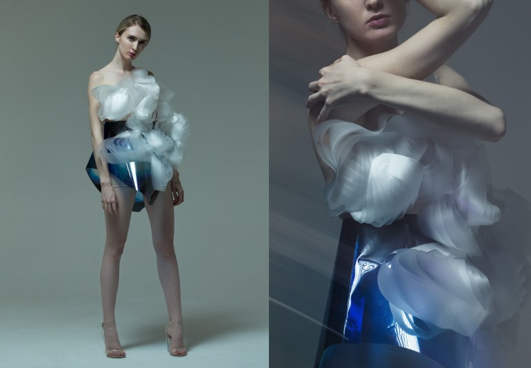I took inspiration from a latex-like, recycled, liquid plastic material I played with when I was a kid. I remember the fun of using this material to draw different shapes: star, flower, animals, and the shapes that don’t make any sense. You can actually draw whatever shape you want. Then you heat it at a certain temperature, and when it cools down it will become a rubber-like finish that will never make any wrinkles. When I was repeating the motion of drawing the shapes in my mind, the idea of “draw your garment” occurred to me. But then I realized that I need textures, a sense of touch. So, I asked myself: why don’t I throw the fabric scraps in the liquid? That’s how the whole textile design process started.