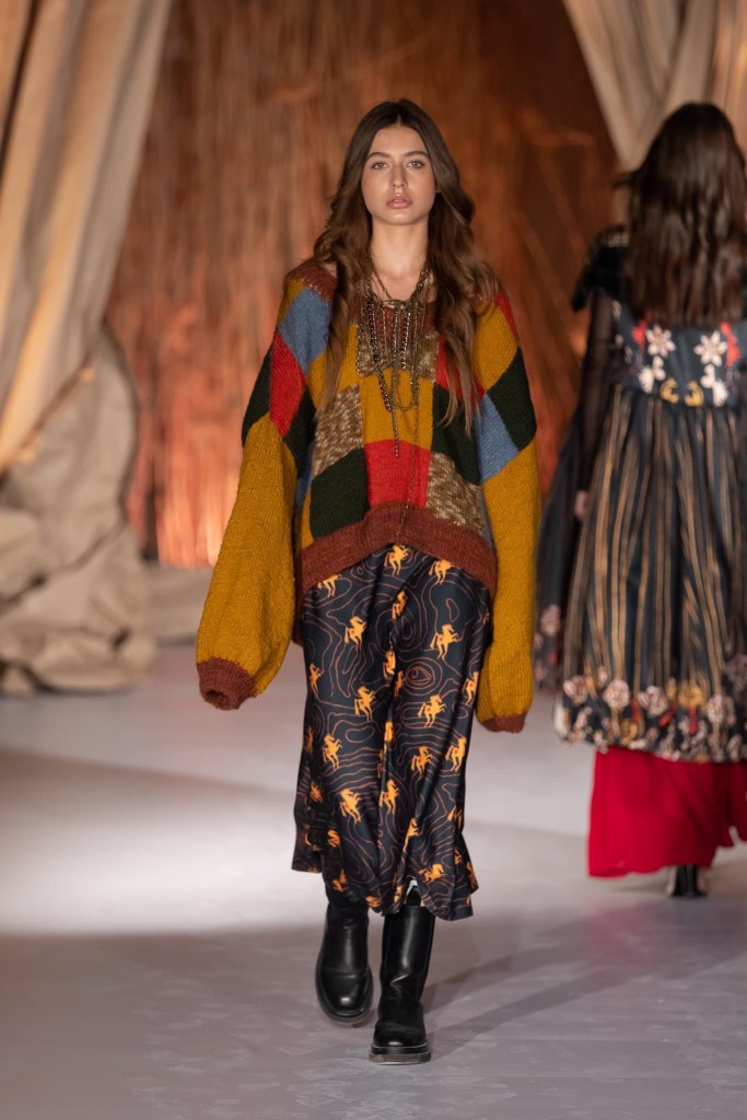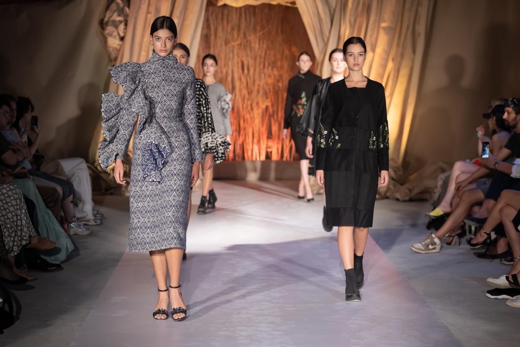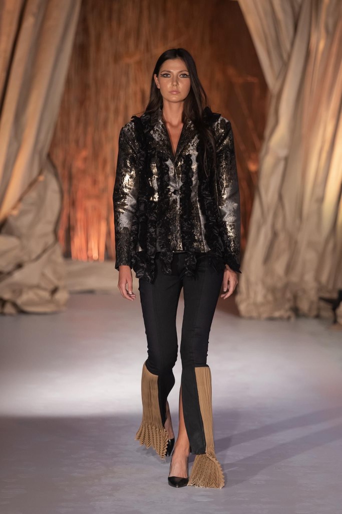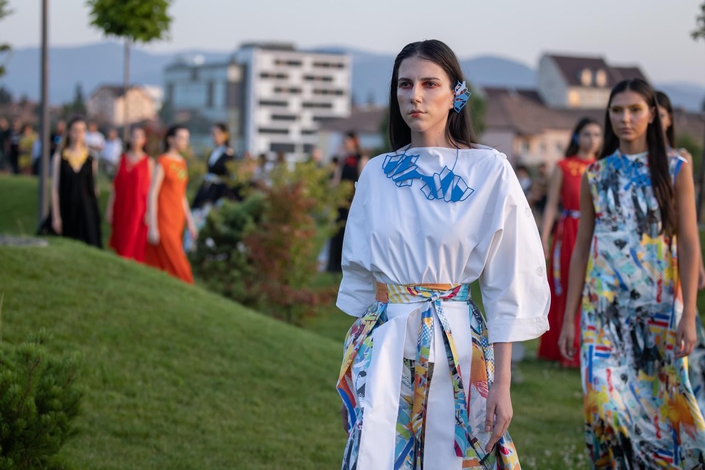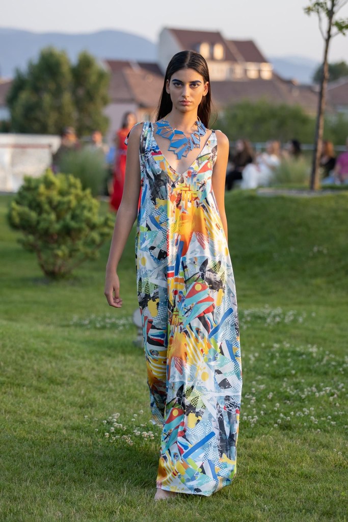 Before the last presentation of the day, at Cinegold took place a visual installation, entitled Home, at the origins – Făgăraș Country, a wide campaign of identity recovery of the traditional port in Romania and in the territories inhabited by Romanians, as it is worn and kept in Nowadays. The project is initiated by the La Blouse Roumaine community, in partnership with the Ţara Făgăraș Community Foundation, the Canvas and Storytelling Museum, Mândra Chic and local volunteers, in order to reconnect and develop communities through what is most valuable: cultural heritage. The event started at 6 pm. At 8 pm, on the terrace of Sibiu Promenade, the Synergia collection was unveiled to guests and spectators, a collection of 12 outfits that gives positive energy and harmony to the shapes that shape the silhouette, being inspired by the visual identity of Sibiu Promenade. The collection was made by the clothing designer Raluca Elena Coșăreanu.