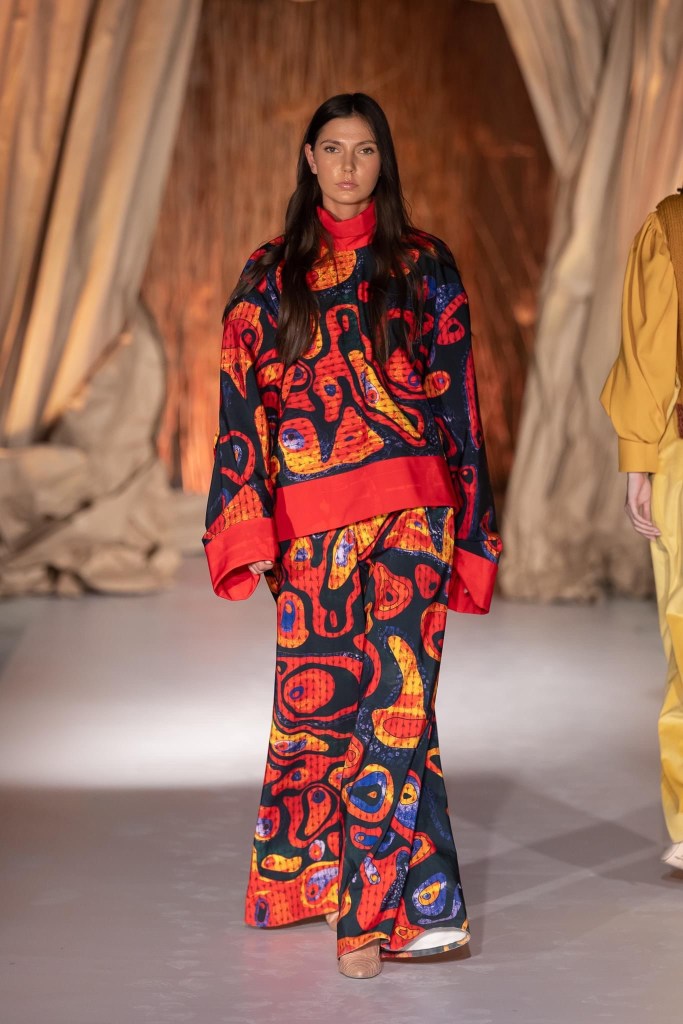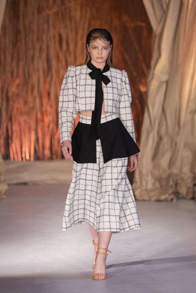 Synergy collection outlines a versatile feminine figure to whom timelessness is a reason for the identity construction of a unique style of clothing. The contemporary trend is built and inspired by the study and patterns of various sartorial periods, in hybrid constructions and creative interpretations. The chromatic patterns built from the game of a well-established and recognizable visual identity, as well as the accessories made with new technologies, represent the interlude that connects and brings unity to each piece of clothing. When we deconstruct the outfits, each of them takes the place of a dramatic piece of its own. Gathered together, they merge into a suite of times and times. The past and the future find their performative space in the power of “now.”