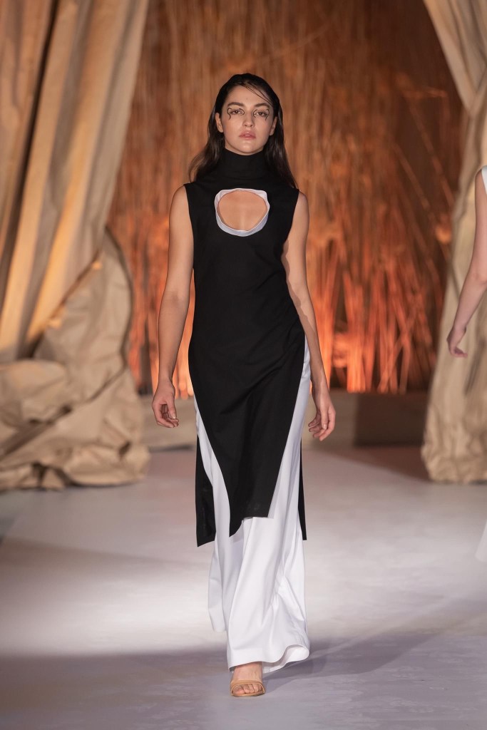 Inspired by the abstract paintings of Al Held (an abstract expressionist painter), I’ve created the Echo minimalist collection, named right after one of his works, bringing into focus and re-enacting the circle bicolor element. The circle represents evolution as a transformational process, the beginning and the end, the eternity. Minimalism never begins or ends, the joining of black and white continue to move within the circle, elegantly. The natural, sustainable materials also transform themselves on the line of time. The entire universe of sustainable clothing maintains things in a constant state of movement, a progression that inspires me towards continuity.