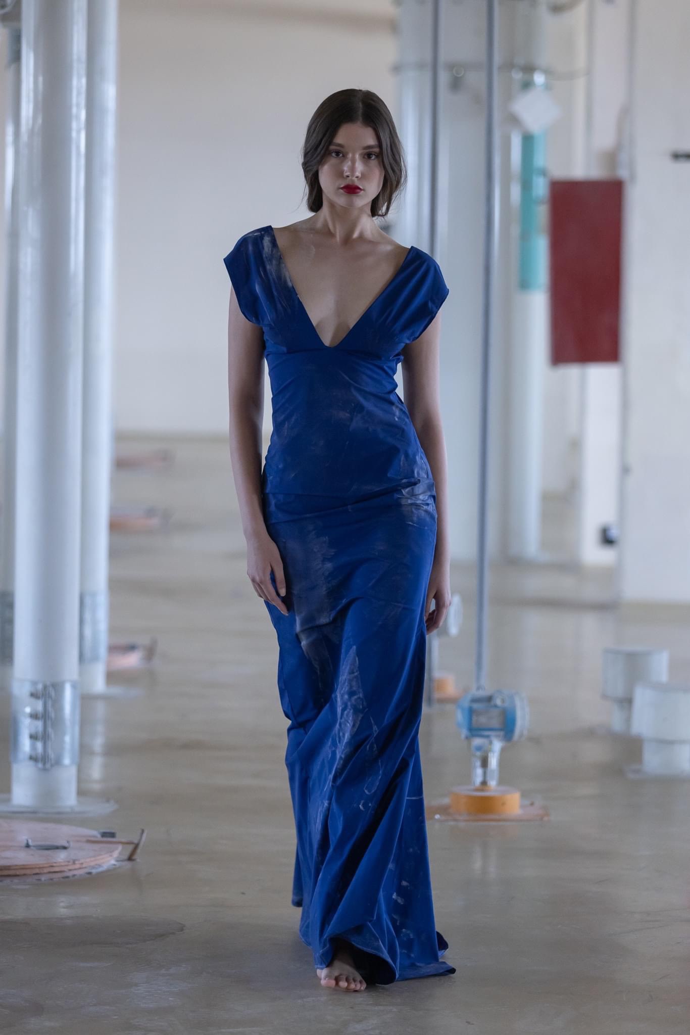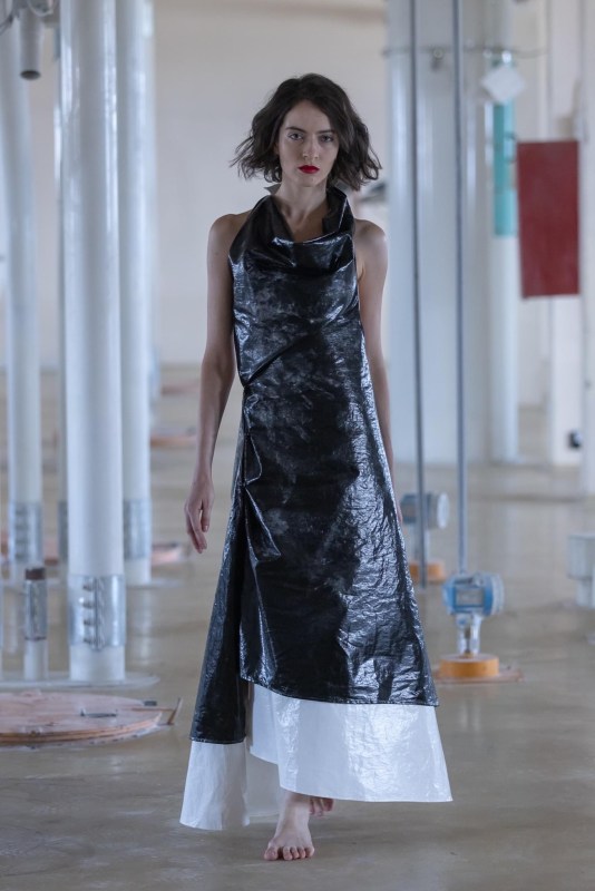 aimed at current trends, emphasizing the impersonal nature of clothing. The color scheme is based on the industrial landscape with a touch of orange that means to bring out of anonymity the wearer and doubles as an signal of alarm about standardized style. In regards with tech-human-industry relationship, the collection takes a pro-human stand by using only natural fibers sourced locally.