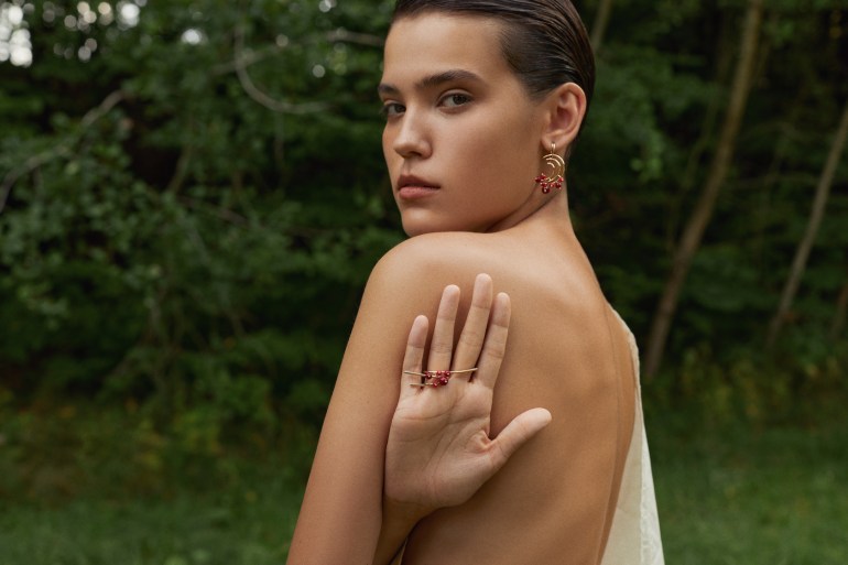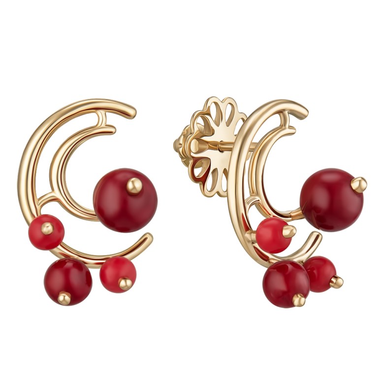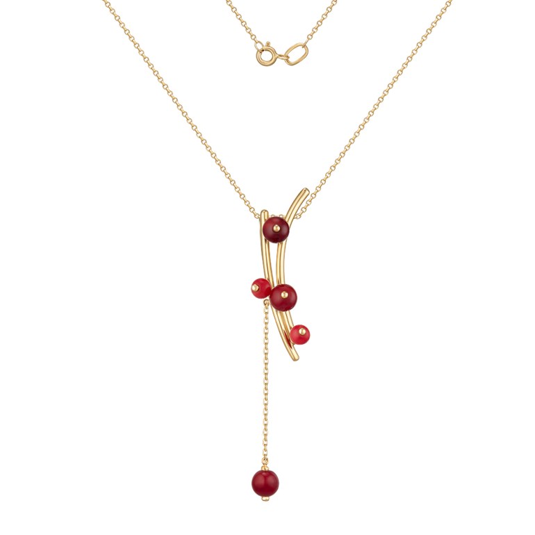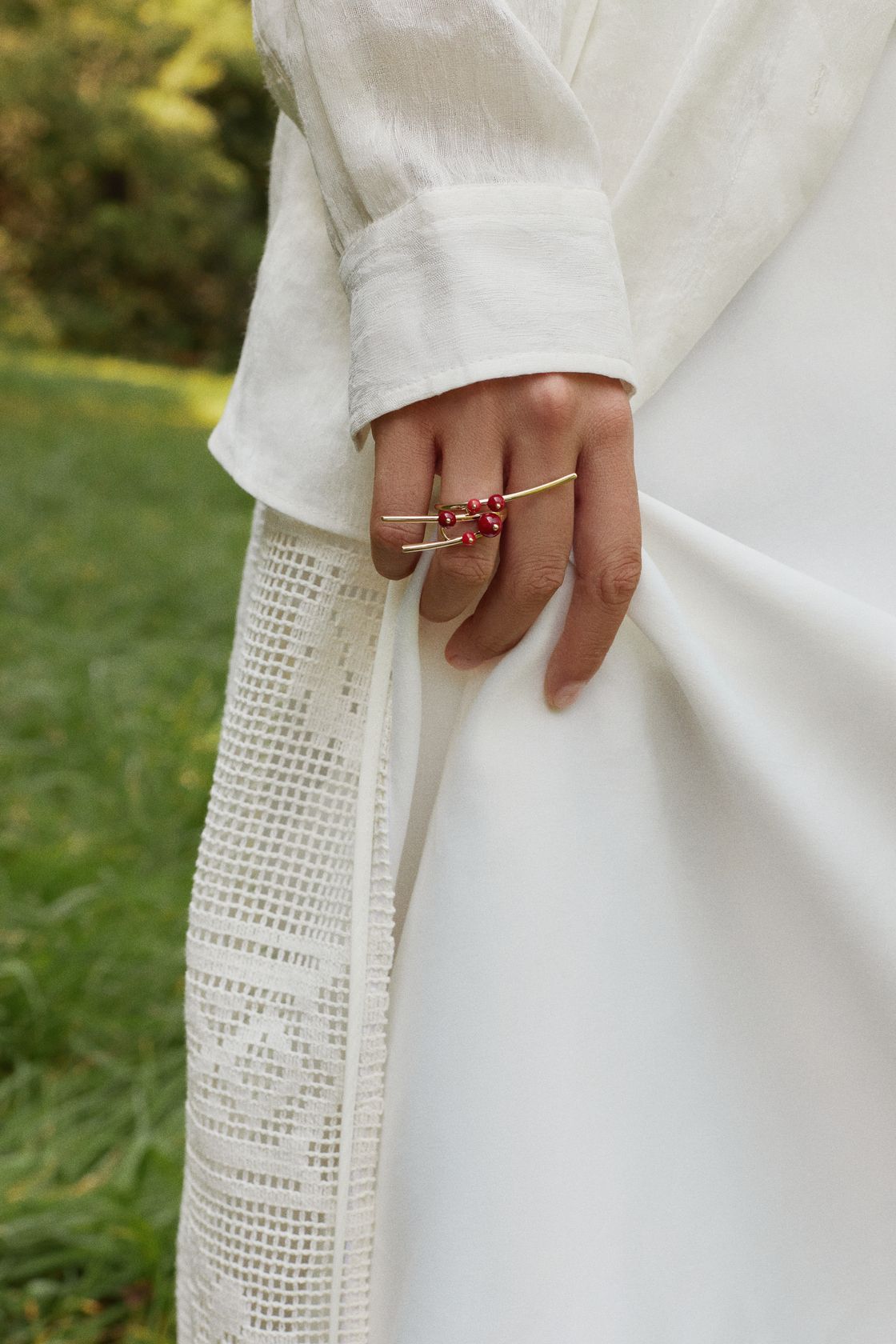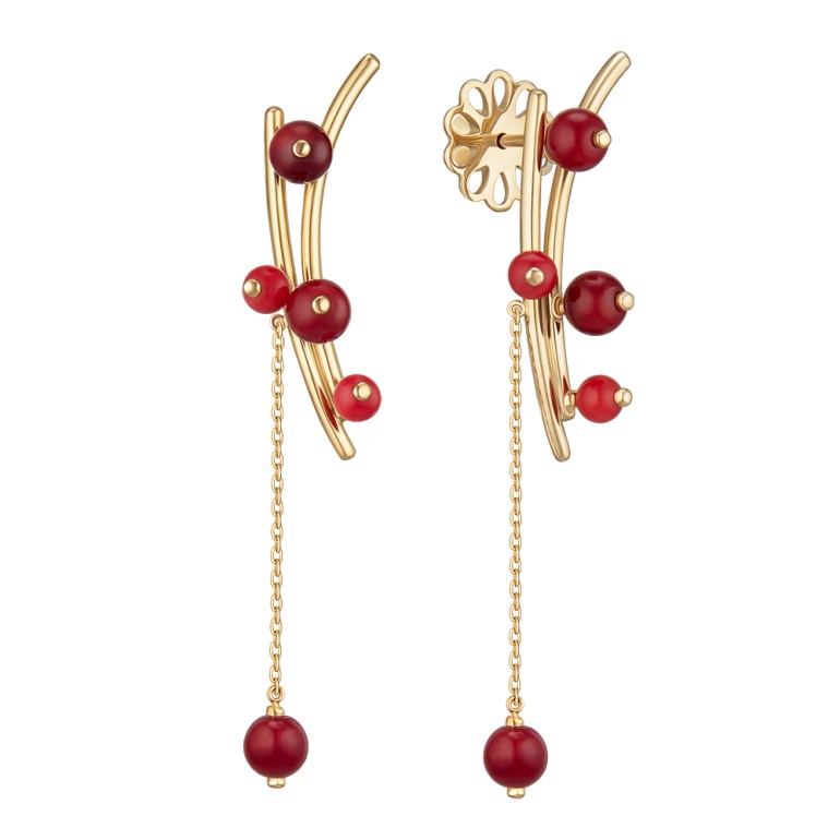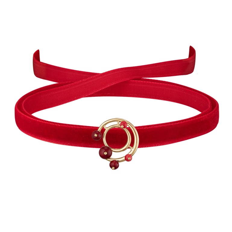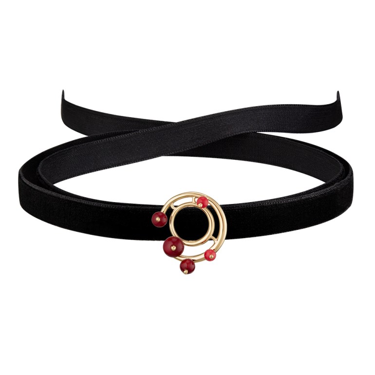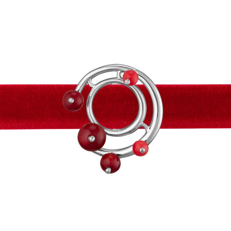 The collection includes 12 pieces of jewelry in white and yellow gold. The KALYNA flagship is a rigid necklace that gently wraps the neck, and branches with coral viburnum clusters lower to the heart. Collection has universal pendants that can be supplemented with one of three velvet ribbons to choose from — red, black, or pale pink.
