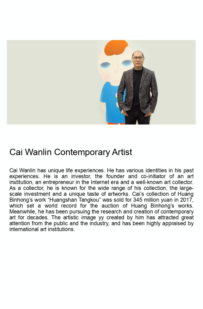 Chinese representative artist Cai Wanlin(蔡万霖), who is an artist, but also one of the top ten collectors of Chinese artworks and art host of Dayuntang Art Organization will be part of the exhibition. In the past 30 years, he has been engaged in art creation and the collection and research of Chinese modern and contemporary art. In October 2020, Cai Wanlin(蔡万霖)’s art exhibition was exhibited at Beijing 798 Taihe Art Center, which mainly exhibited his series of creations with YY” as the main artistic image language. Cai Wanlin(蔡万霖) has called the China’s Yoshitomo Nara, and “He has always been like a bystander, observing society and life, and he has experienced it personally.”