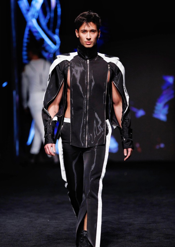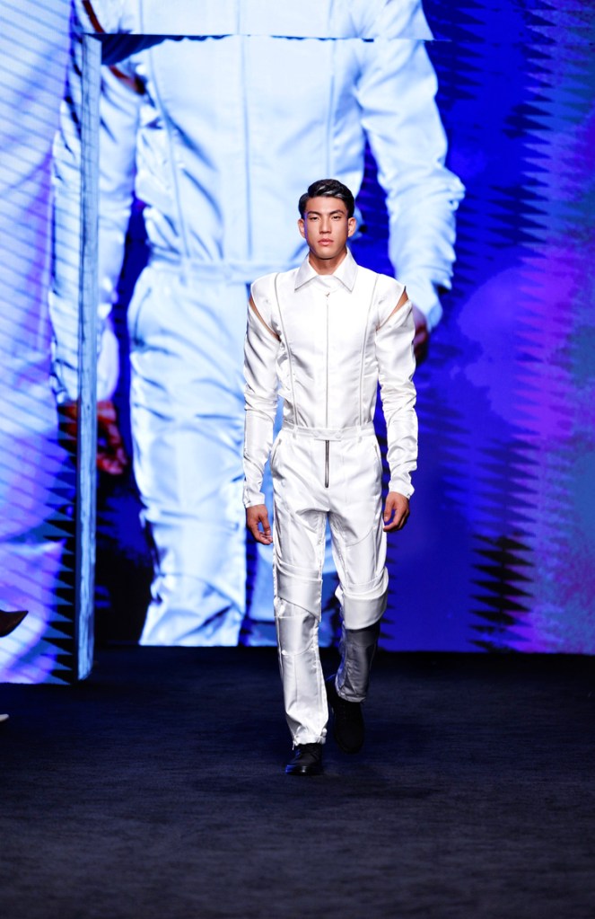 Like all great fashion designers, there’s a science behind the seams. The key to Auren’s genius? Space. Every stitch is intended to reinforce the outer space theme. The grey, shimmering panels reflect the galaxy’s shining stars, while the buckled belts represent the hardware of a spaceship. This concept is impressively consistent, creating a cohesive collection that gives a taste of something entirely new.