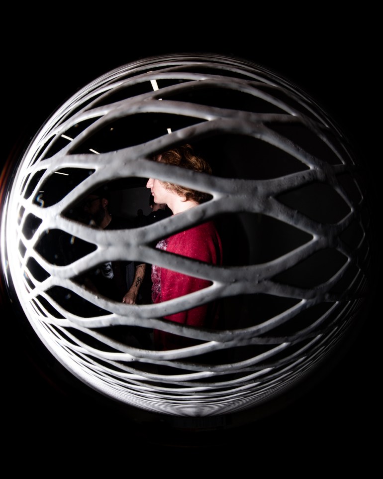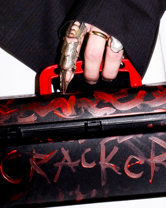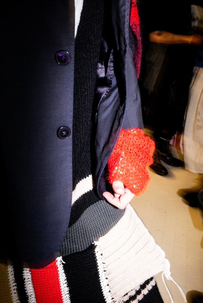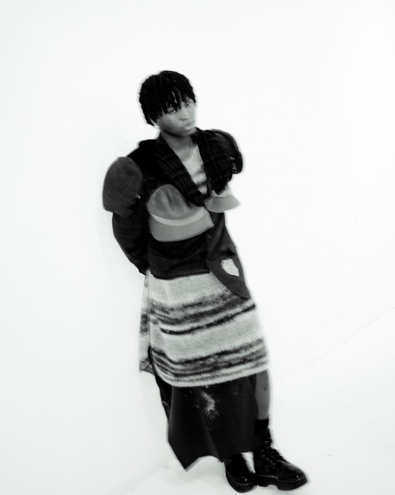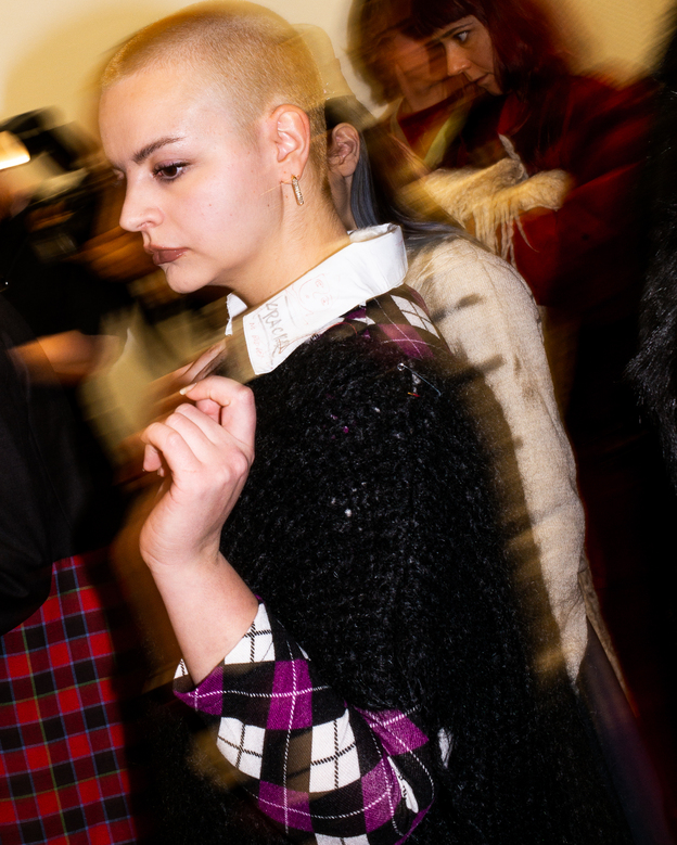 The collection is based on a strong punk ideology, in its original sense: nonconformism, the definition of one’s not aligned and unique identity, the distance from common places and escape from orthodoxy, provocation, and the system’s mockery. All of this is reflected on tailored clothes encrusted with silicone that cracks as if it’s worn, coats made from handmade blankets, knitwear that comes from leftover yarn swatches, white shirts with spray-painted Peter Pan collars, chandelier fragments that become blood drops.