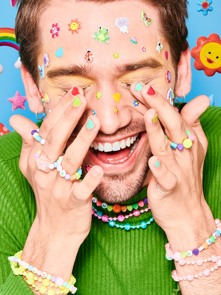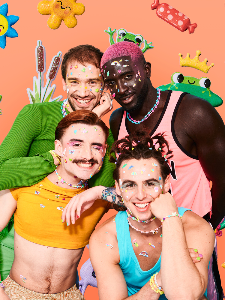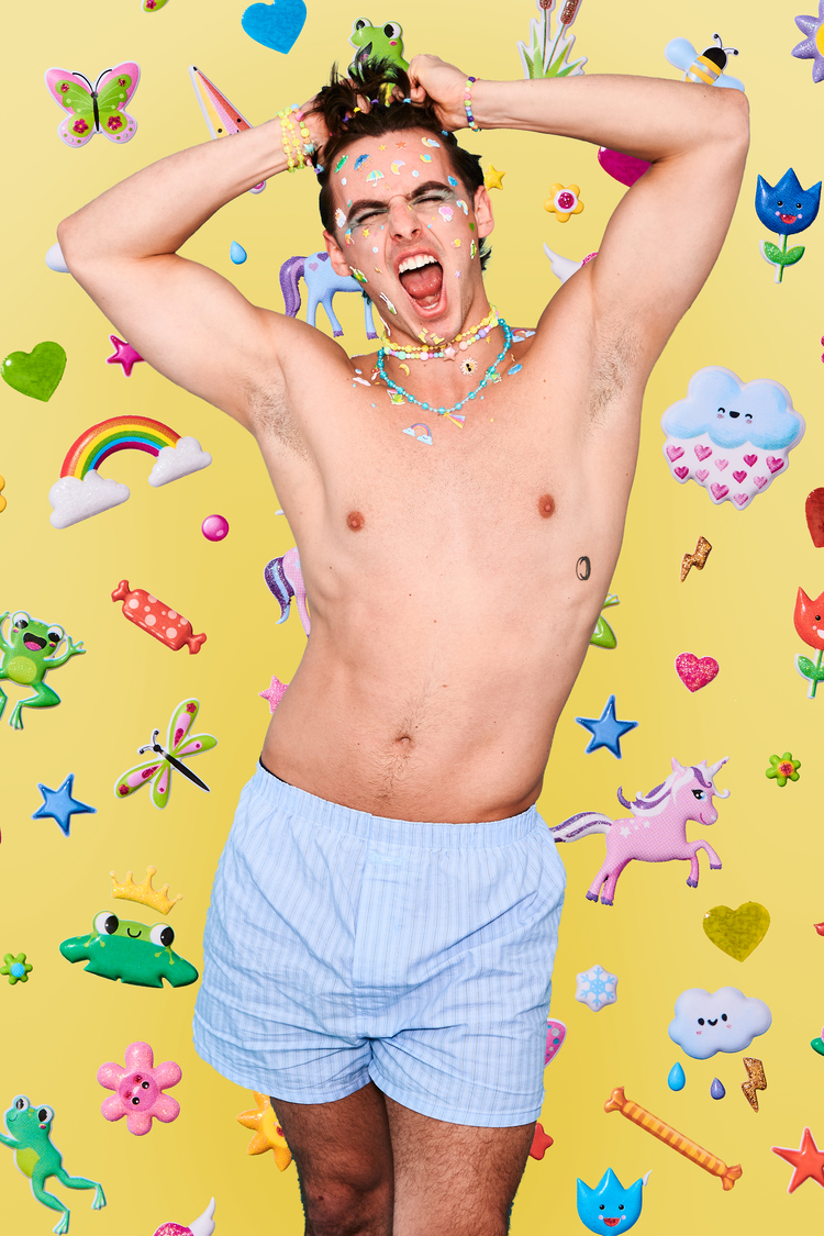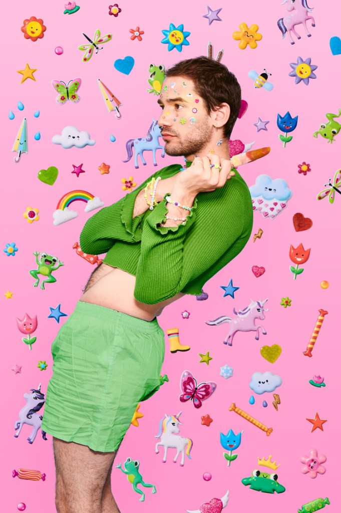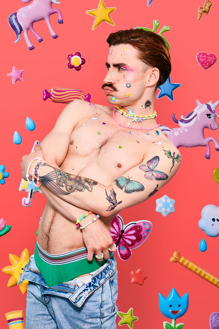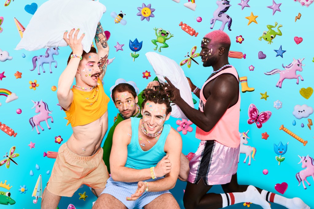 This pyjama party is a throwback to the 90’s, and an ode to male happiness and cheekiness. Growing up, signs of being giggly and overtly joyous were reflected back to me as something to be ashamed of, something that went against my identity as a boy and a man- to-be. I wanted to use pride month as a means to show all the joy and light there is in being queer, and show men of all orientations to show their emotions of joy in a childish way.