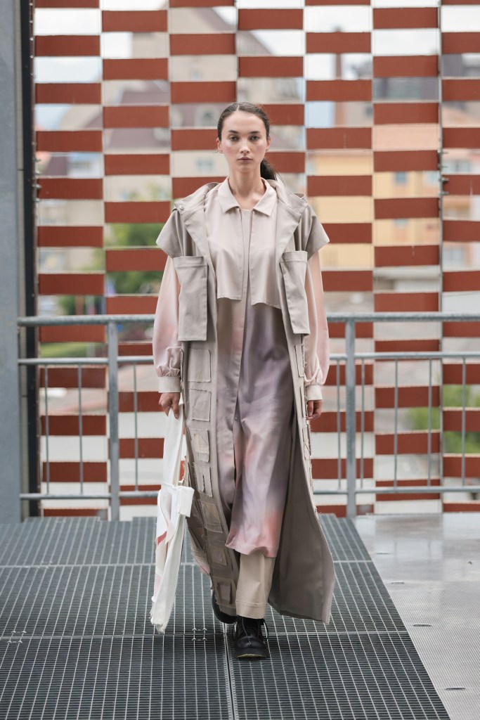 On the external stairs of the Promenada Mall, in a geometric setting close to perfection, the students of the Faculty of Arts and Design of the Western University of Timișoara presented a group collection representing an eclectic selection of creations extracted from the undergraduate and dissertation projects of fashion design graduates. The students’ collections tackled various topics, current in fashion and contemporary society, with a sustainable substrate: from the psychological and emotional necessity of belonging, to the importance of choices, the elevation of a loved one who has passed away, the importance of pure moments as an impact on the present, the integration of ecofeminist moments in everyday clothing, female power and vulnerability, up to the satire of an unlucky day.