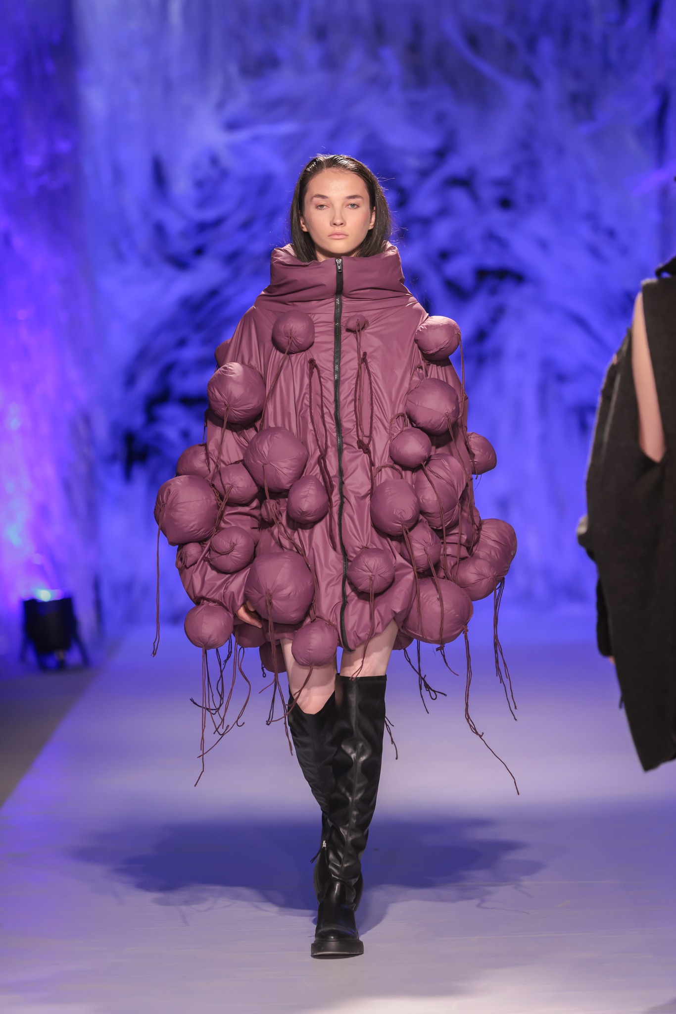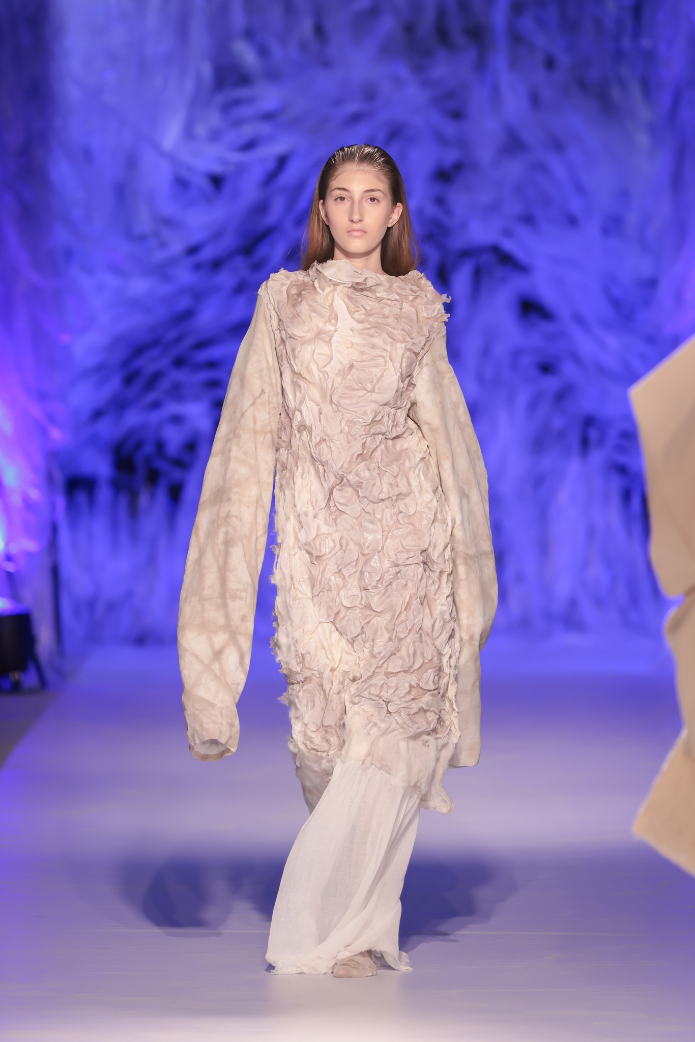Alicja Zdral, Collection “ÆNTRO”: The theme of the collection is entropy and man set against the backdrop of Bauman’s liquid modernity. The designs were made mainly of natural fabrics as well as biofabrics in the form of kombucha leather and bioplastic from own experiments. They were subjected to the process of dyeing with plant-made dyes. The silhouettes combine the techniques of felting, draping and original design solutions.