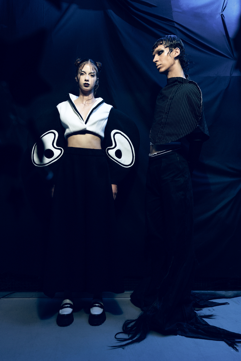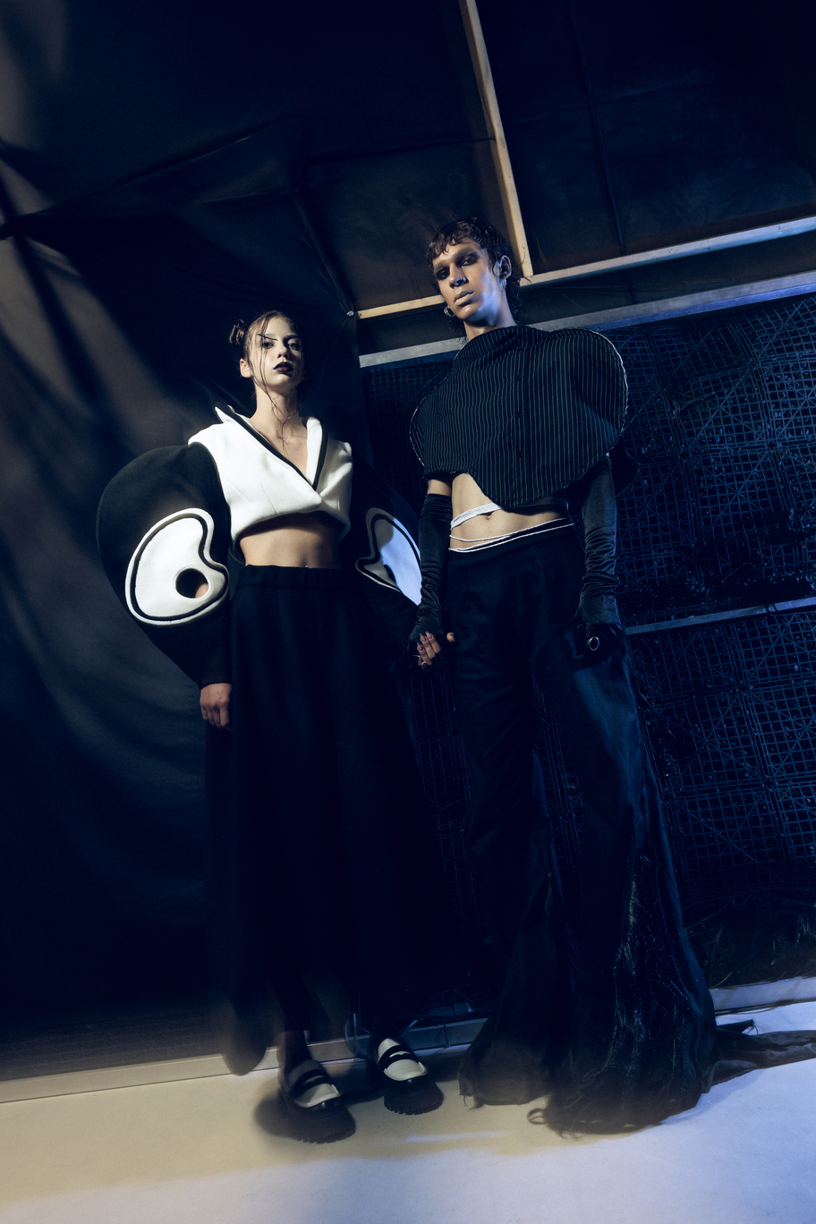 Left – Earrings: Iulia Vlejoanga – Shirt: Anatticus – Corset: Denis Romaniuc – Pants: Kosara Zelenikova