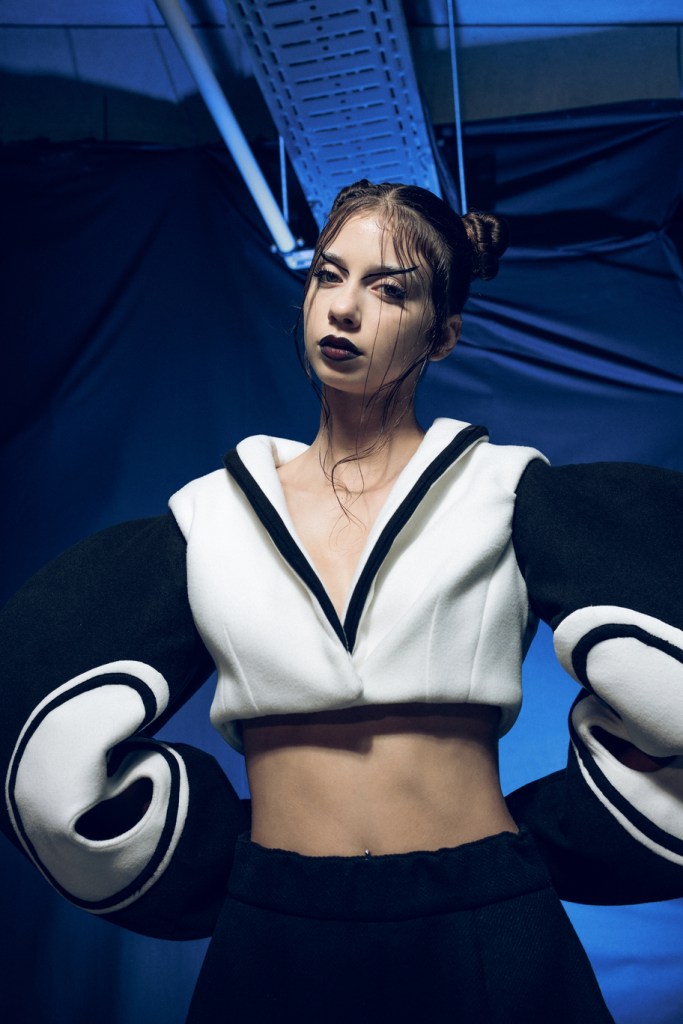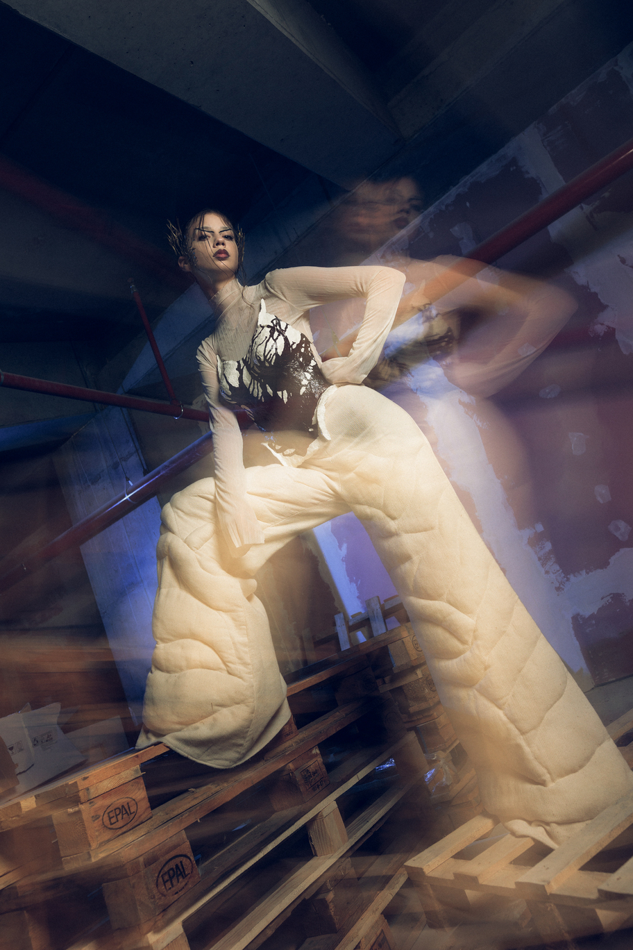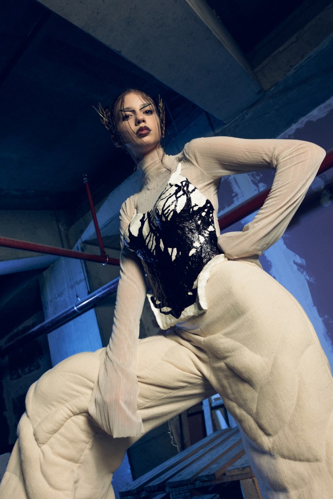 Top: Angela Azamfirei x Hooldra – Pants: Mad House – Gloves: Alexandra Tigaeru