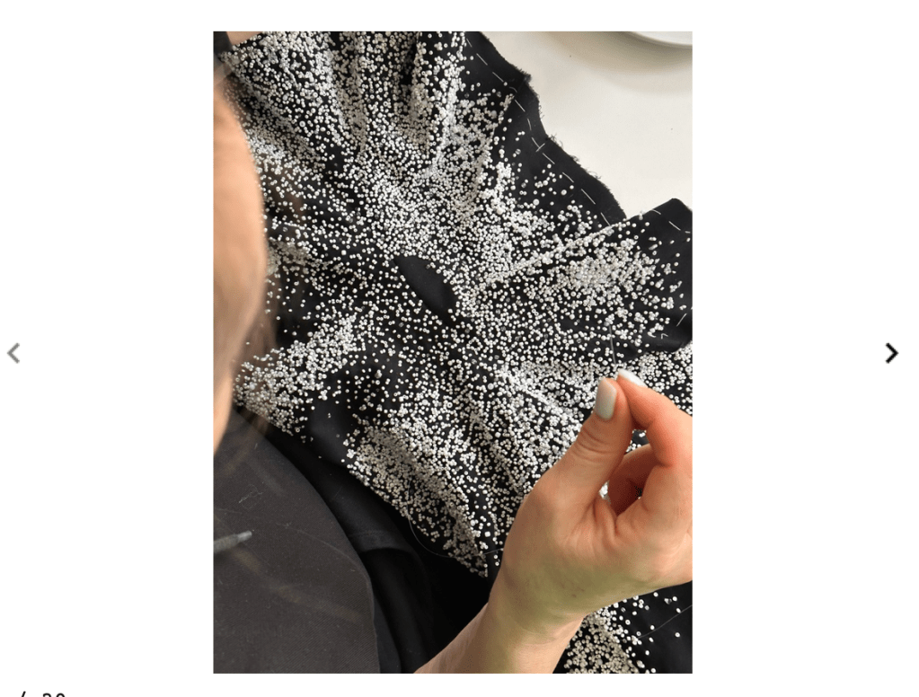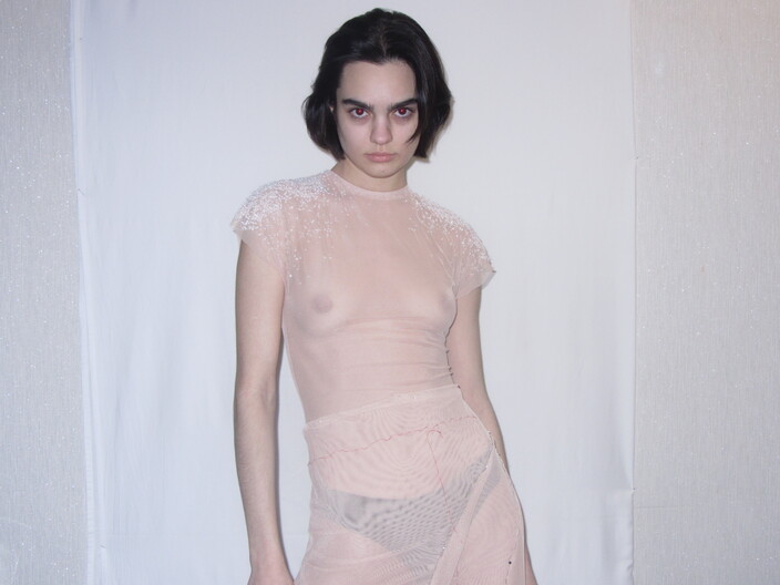 From oversized coats to intricately layered skirts, Ershova’s silhouettes reflect the natural grace of movement while continuously engaging the viewer’s imagination. Her choice of materials—blending matte finishes like merino wool with the iridescence of rocailles and sequins—highlights her expert understanding of contrast and balance in fashion. This technical prowess, rooted in her rigorous training at Central Saint Martins, elevates her designs beyond mere clothing to wearable art.