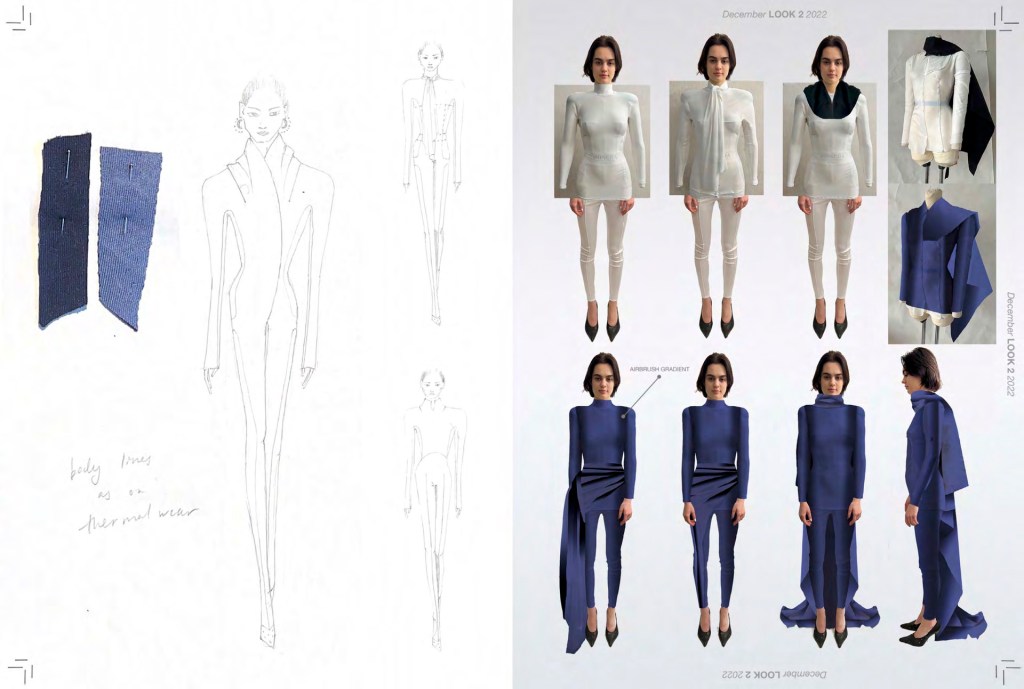 Drawing inspiration from Renata Litvinova’s cinematic depiction of relentless winter in “The North Wind,” Mariia encapsulates the dichotomy of beauty and desolation. The imagery of snow, representing both fragility and a devastating force, is mirrored in the collection’s aesthetic—a juxtaposition of sculptural silhouettes cloaked in the raw elegance of visible construction and texture. This combination creates garments that resonate with the contemporary woman’s need for functionality without sacrificing elegance.