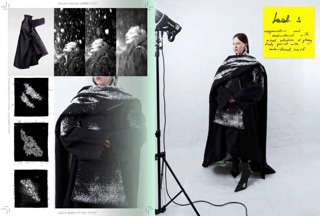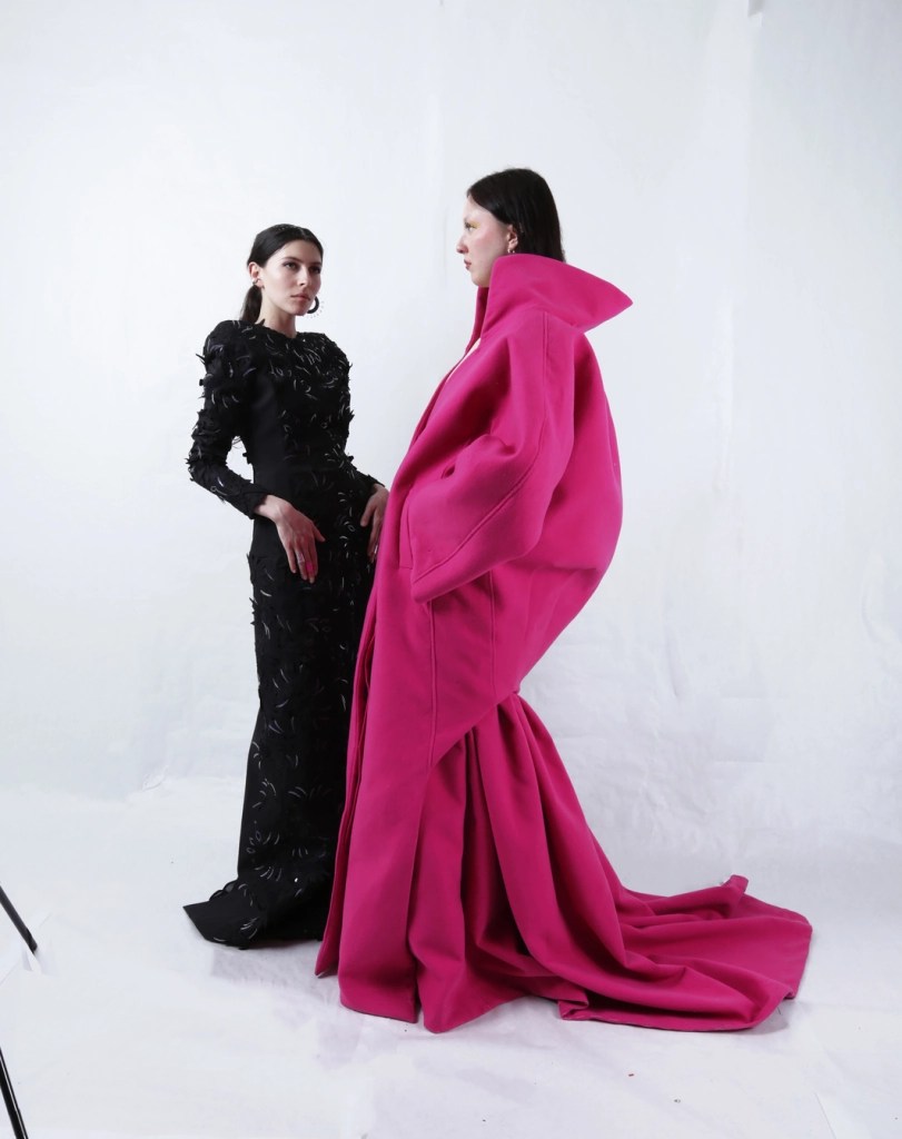 Drawing inspiration from Renata Litvinova’s cinematic depiction of relentless winter in “The North Wind,” Mariia encapsulates the dichotomy of beauty and desolation. The imagery of snow, representing both fragility and a devastating force, is mirrored in the collection’s aesthetic—a juxtaposition of sculptural silhouettes cloaked in the raw elegance of visible construction and texture. This combination creates garments that resonate with the contemporary woman’s need for functionality without sacrificing elegance.