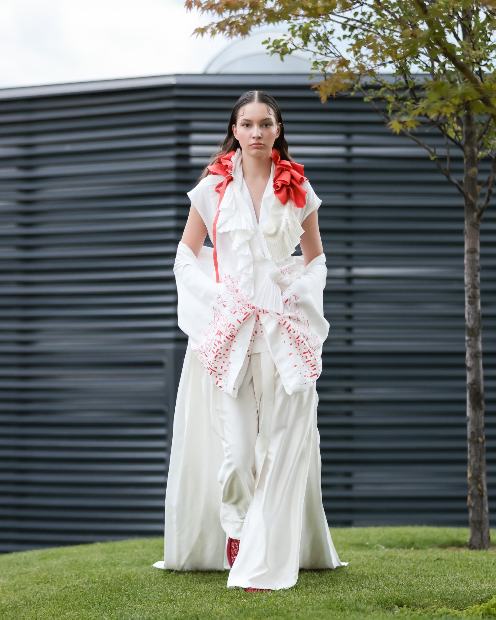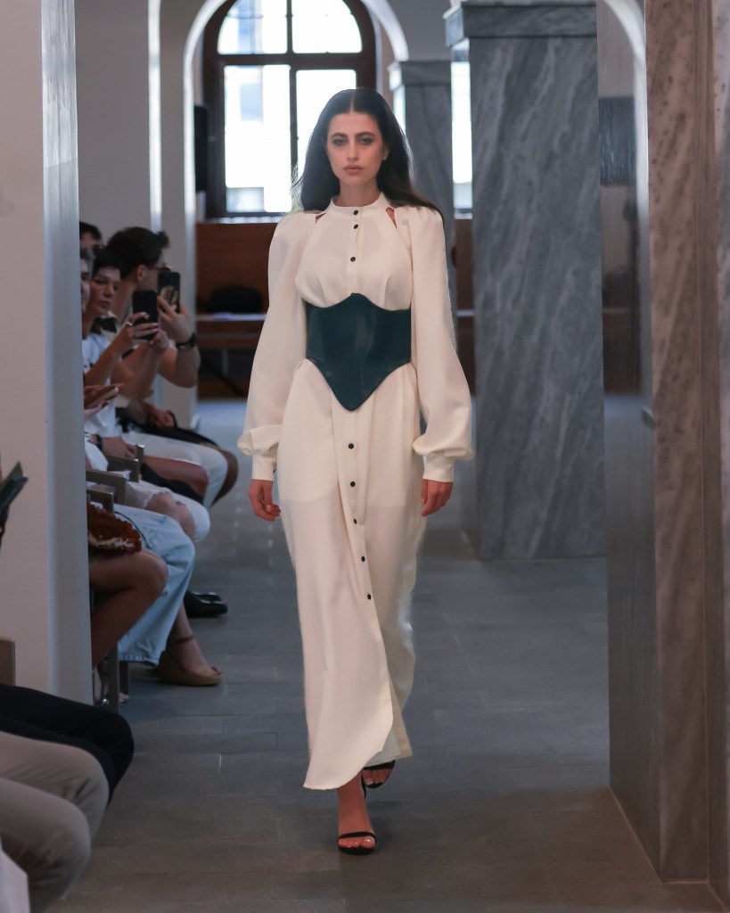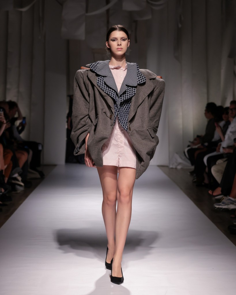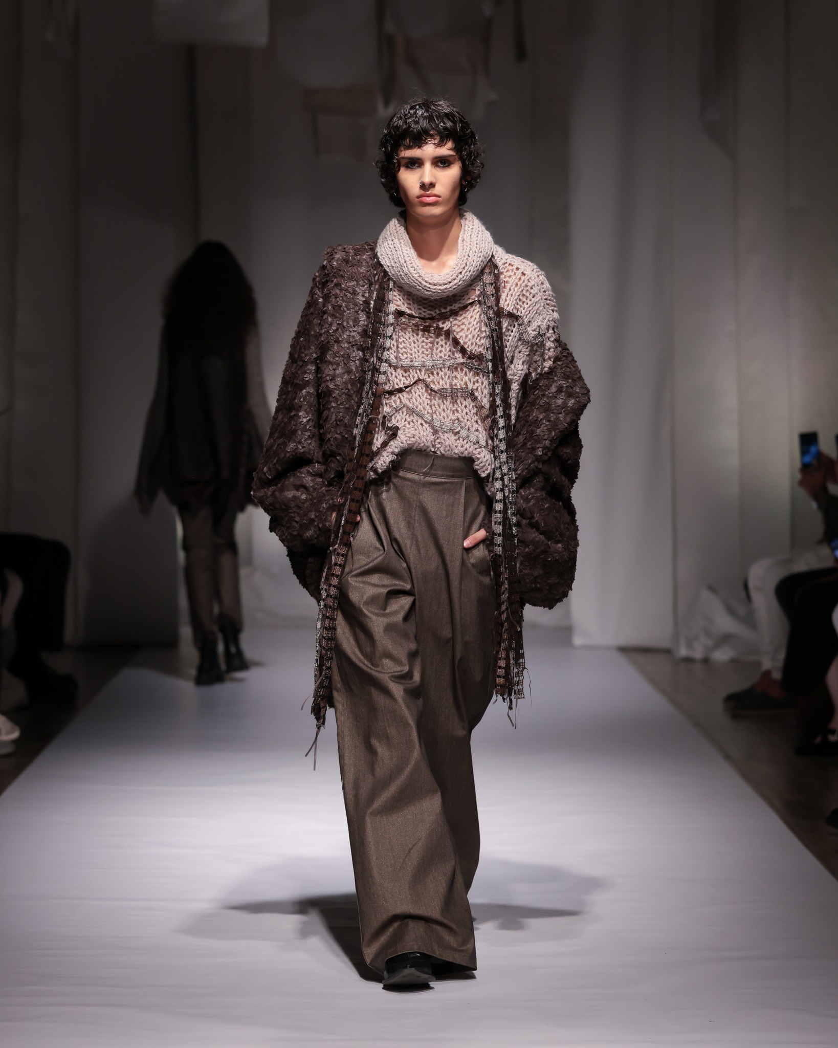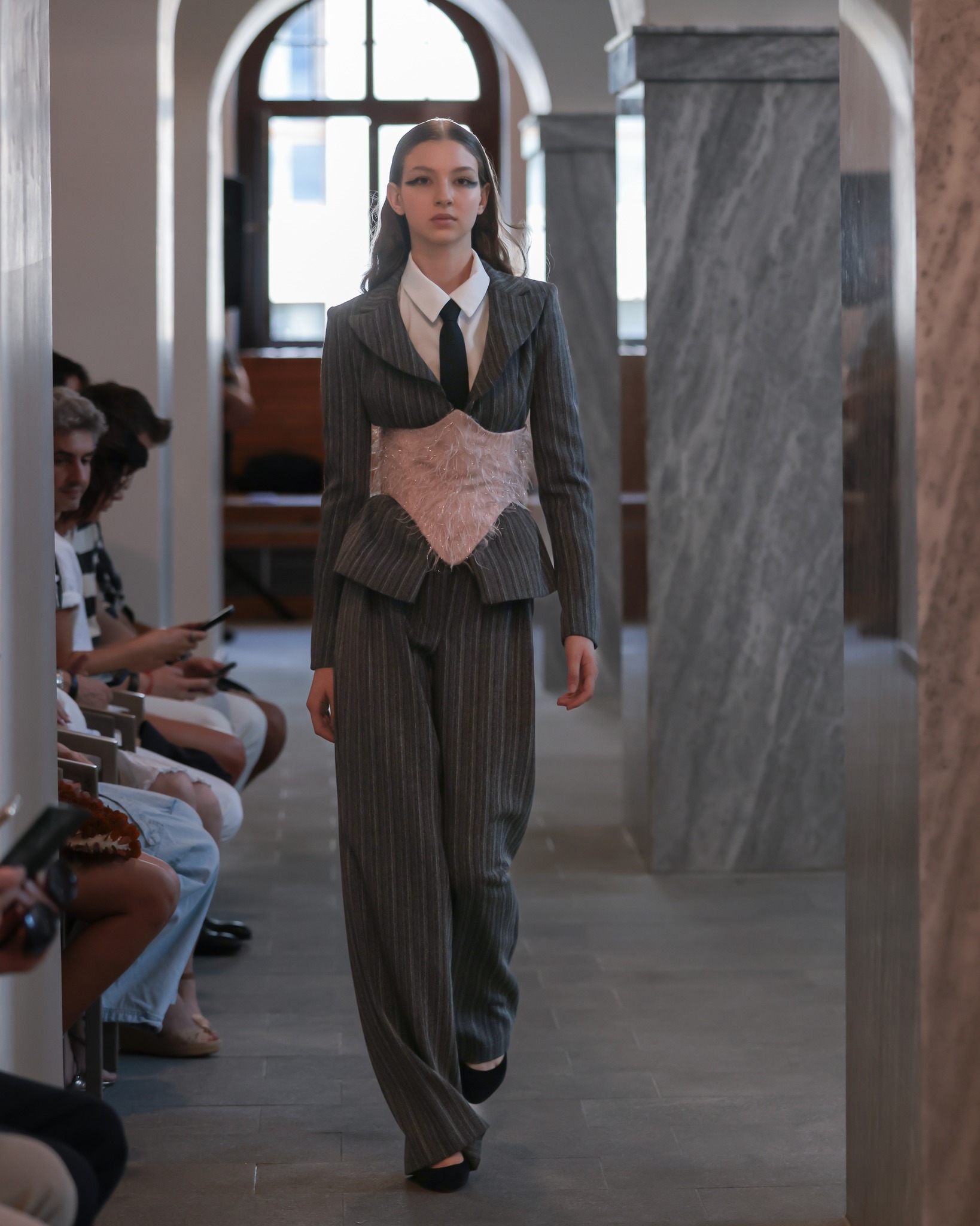 Following this, Blanka Gotić presented “Obedience in Fragments,” a striking exploration of the Mormon community’s symbolism, utilizing materials such as poplin, sheer fabrics, and natural twine. This collection elegantly wove a poetic reflection on faith and feminine identity, inviting us to ponder the intricate interplay between belief and self-expression.