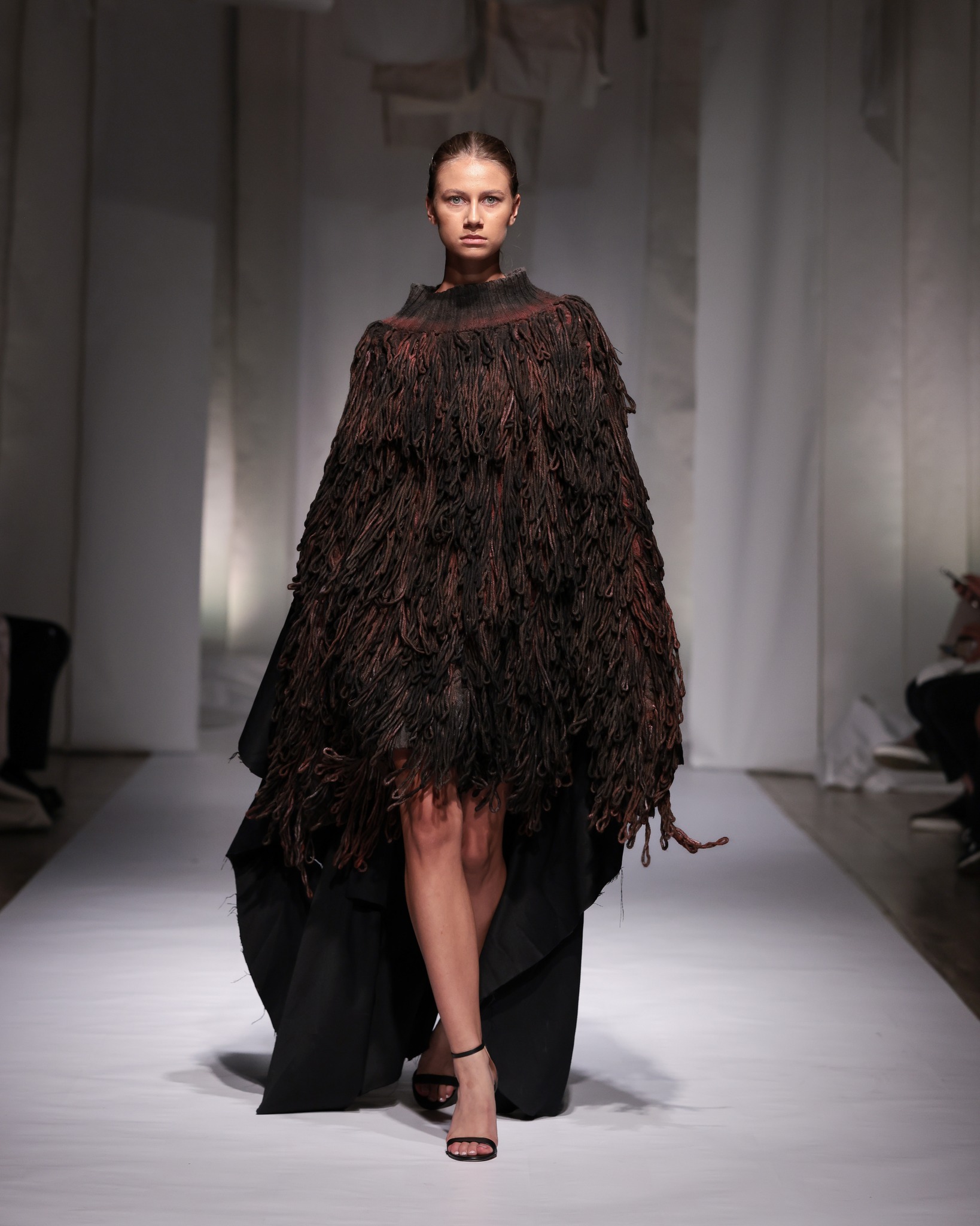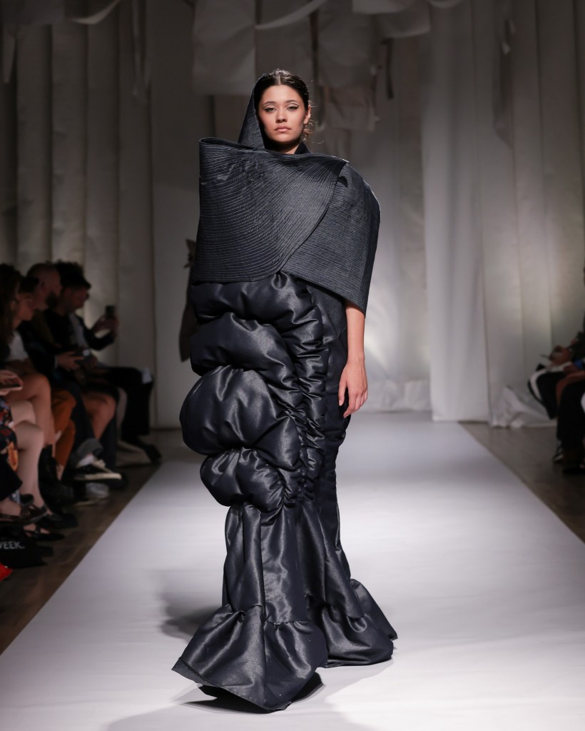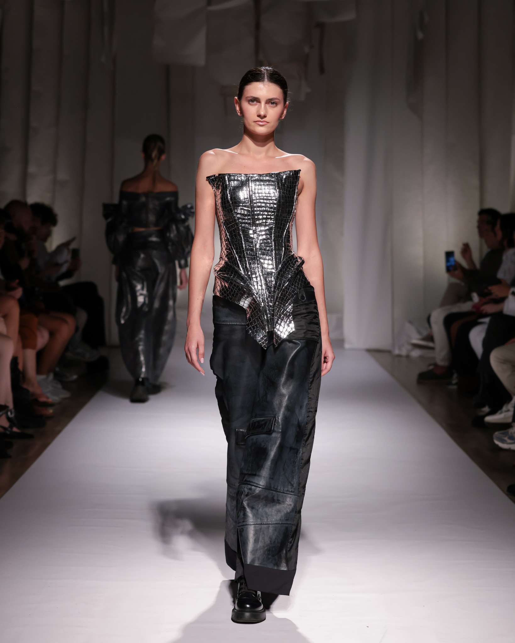 The University of Oradea’s “Error” collection ventured into the avant-garde realm of post-human silhouettes and expansive volumes, employing industrial materials to explore the profound transformations society may face in the near future. This thought-provoking showcase prompted the audience to contemplate the evolution of identity amidst an ever-changing landscape.