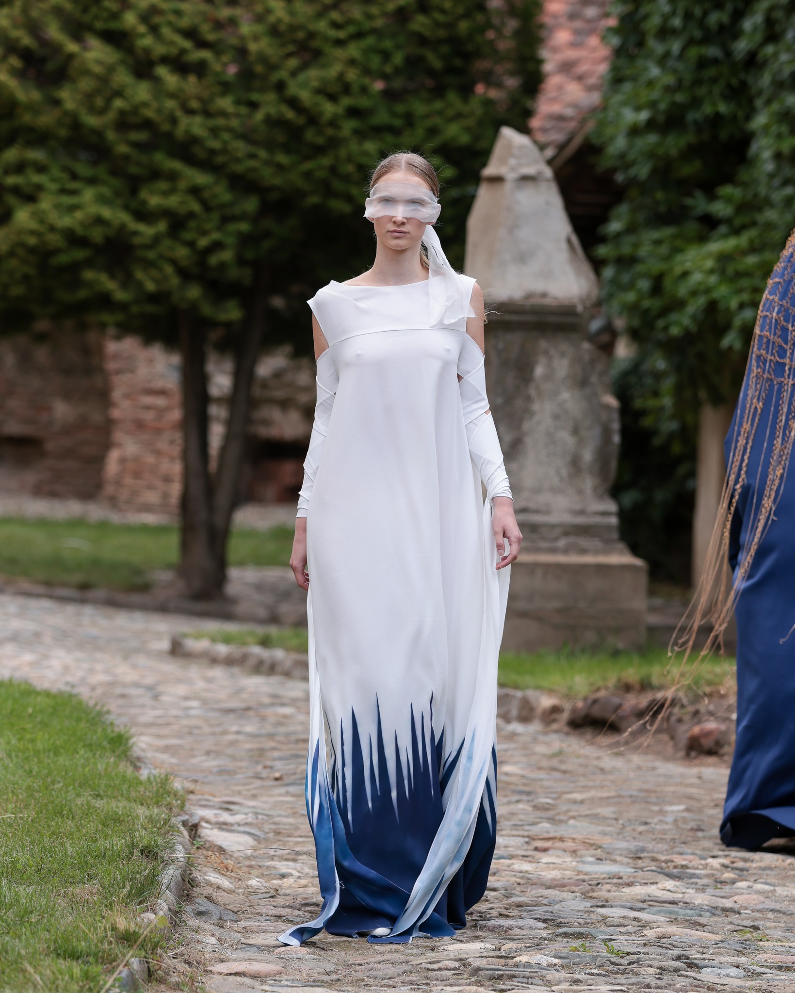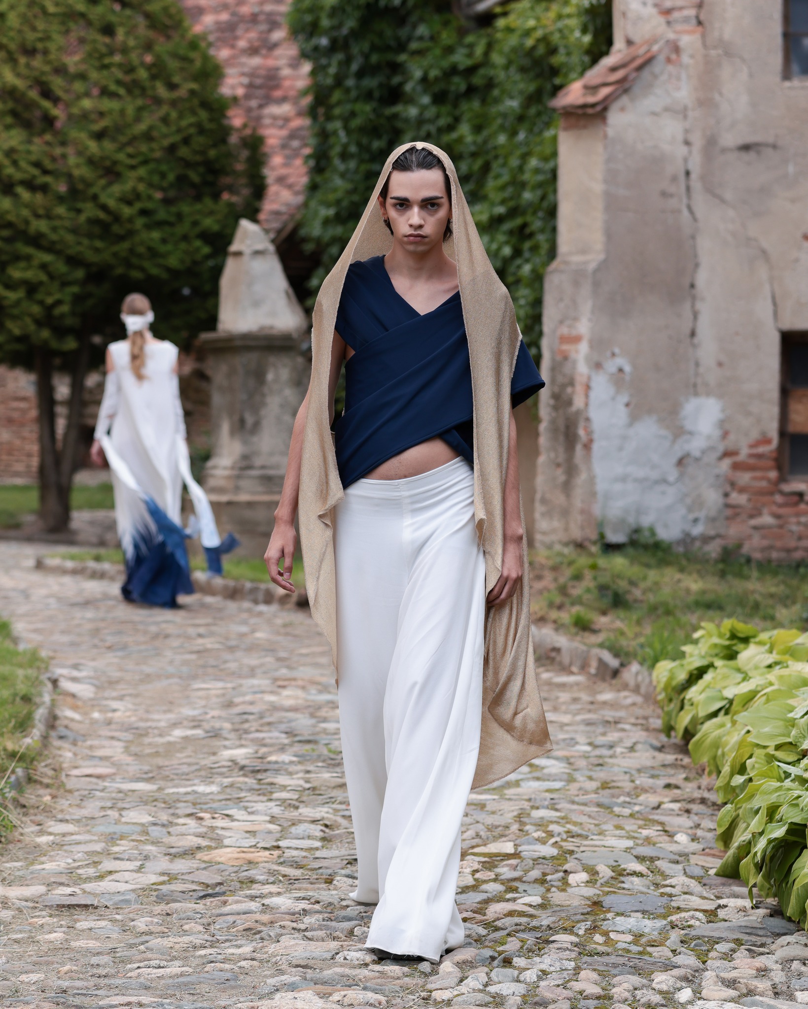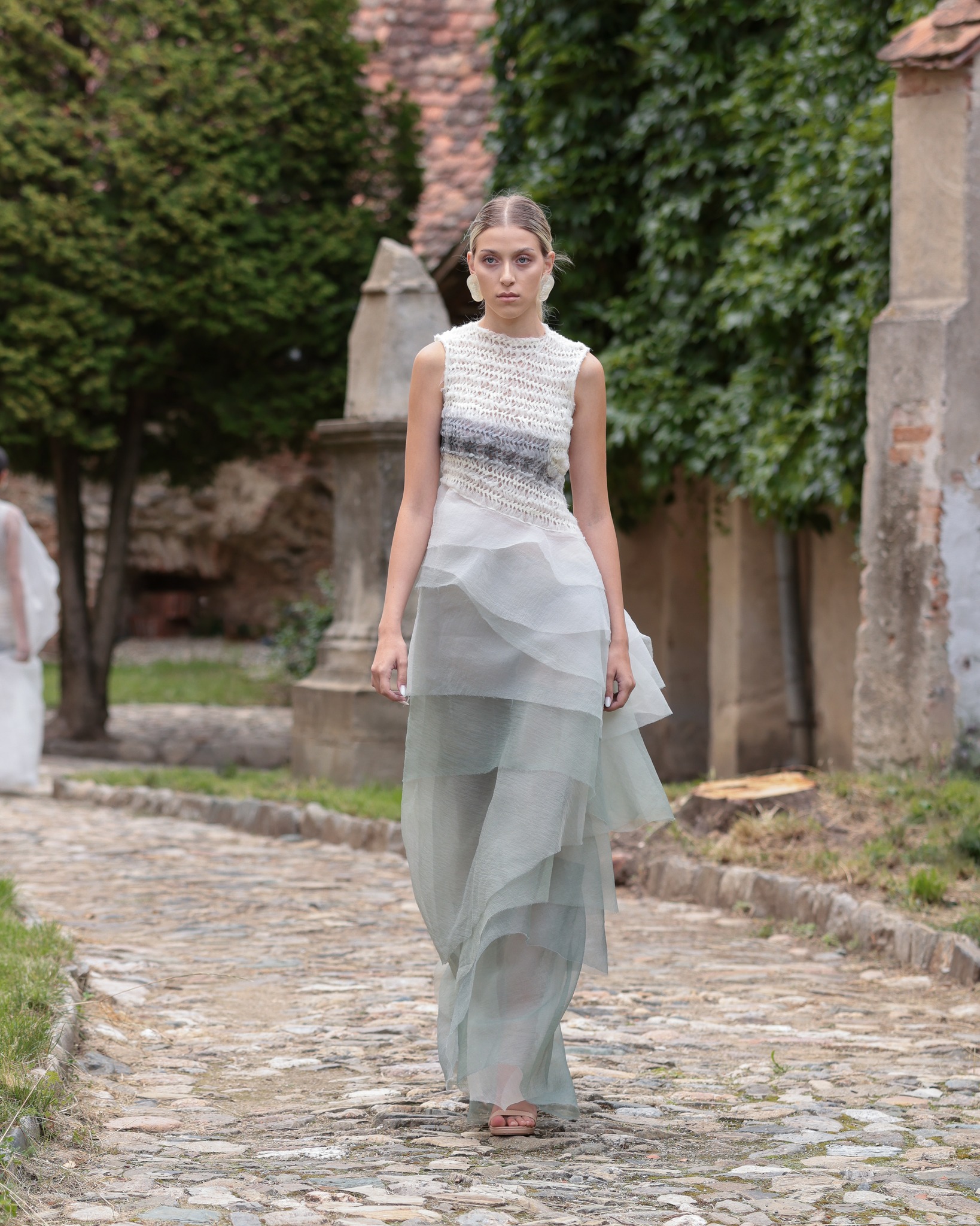 The day commenced within the storied courtyard of the Evangelical Church in Cisnădie, a location steeped in history that perfectly echoed the profound themes woven throughout the collections. Kicking off the presentations, the collective showcase from the Technical University of Moldova unfolded a compelling narrative steeped in exploration of femininity, solitude, and a reimagined interpretation of the iconic Romanian poem “Luceafărul.” With masterful craftsmanship and a thoughtful palette, this collection was more than visual stimulation; it was an emotional journey that invited the audience to reflect on the complex layers of identity and experience. Each piece exuded a distinctive grace that harmonized decorative finesse with innovative fabric combinations, compelling us to embrace the beauty of vulnerability.
