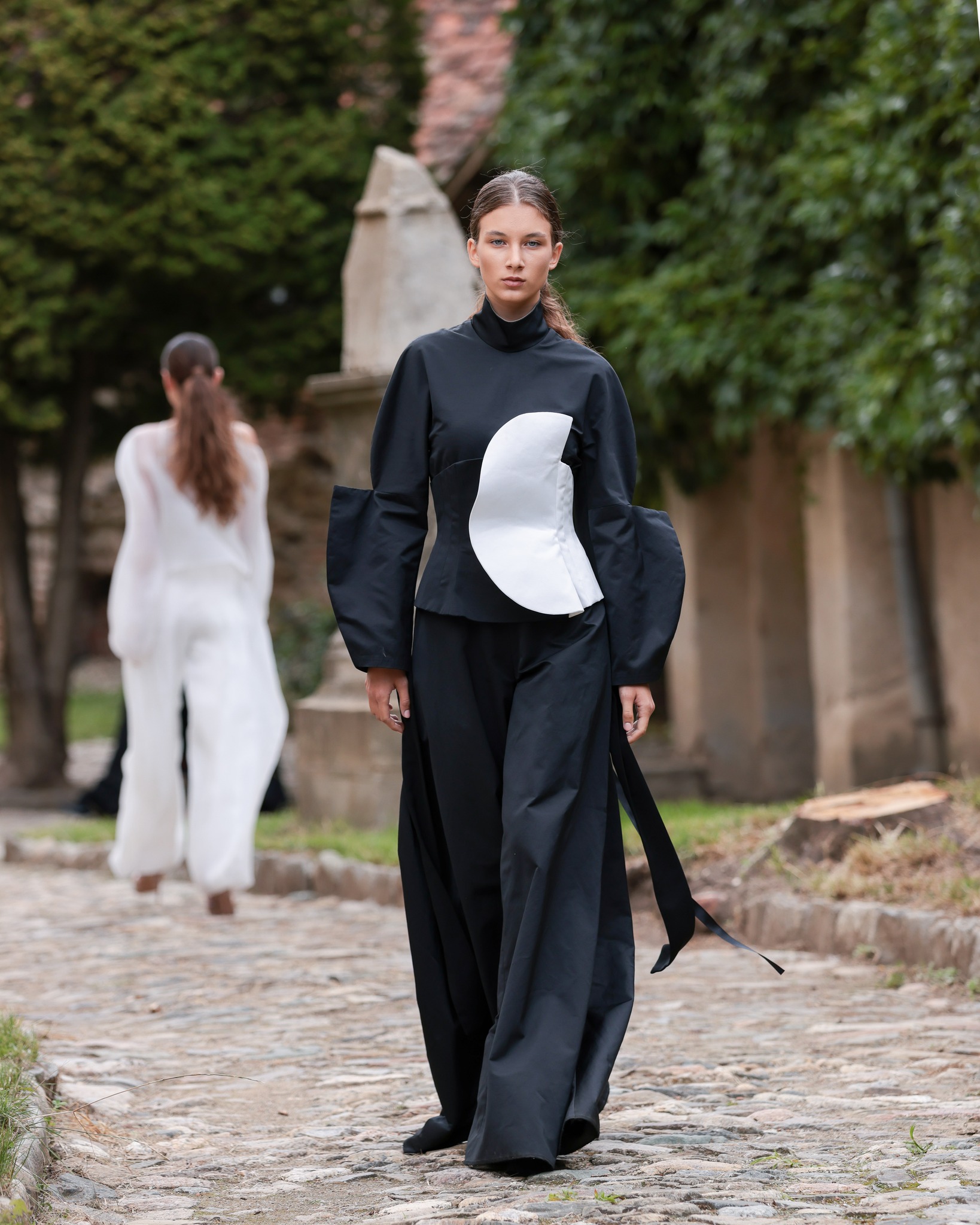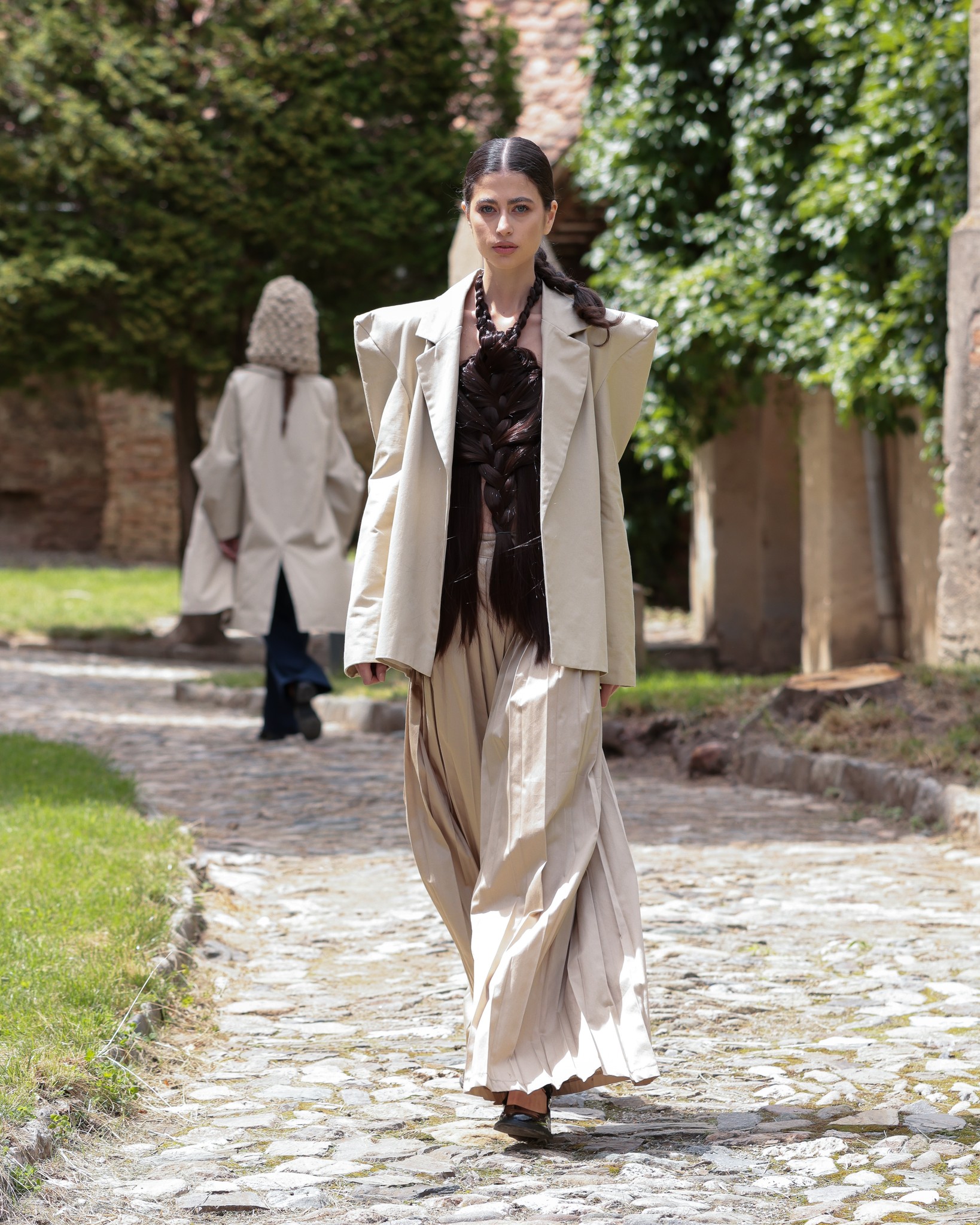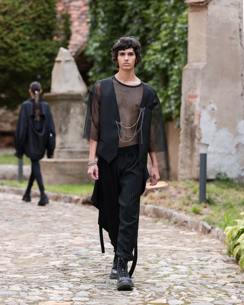 The day commenced within the storied courtyard of the Evangelical Church in Cisnădie, a location steeped in history that perfectly echoed the profound themes woven throughout the collections. Kicking off the presentations, the collective showcase from the Technical University of Moldova unfolded a compelling narrative steeped in exploration of femininity, solitude, and a reimagined interpretation of the iconic Romanian poem “Luceafărul.” With masterful craftsmanship and a thoughtful palette, this collection was more than visual stimulation; it was an emotional journey that invited the audience to reflect on the complex layers of identity and experience. Each piece exuded a distinctive grace that harmonized decorative finesse with innovative fabric combinations, compelling us to embrace the beauty of vulnerability.