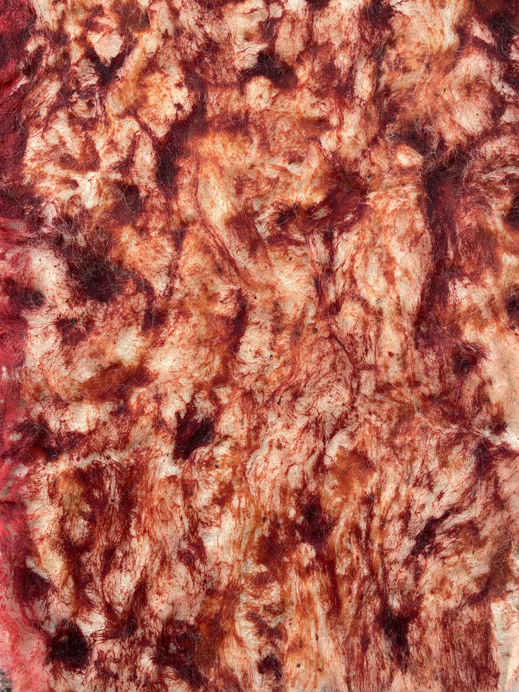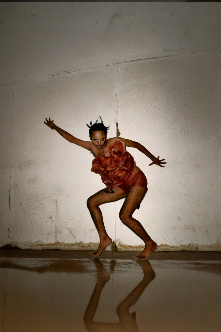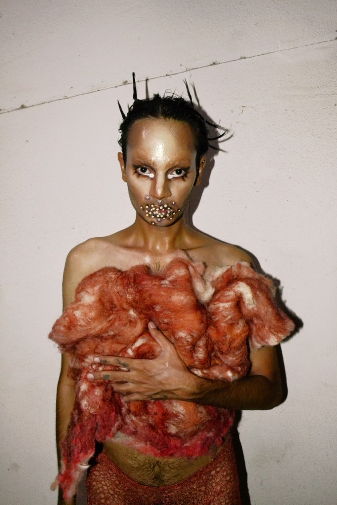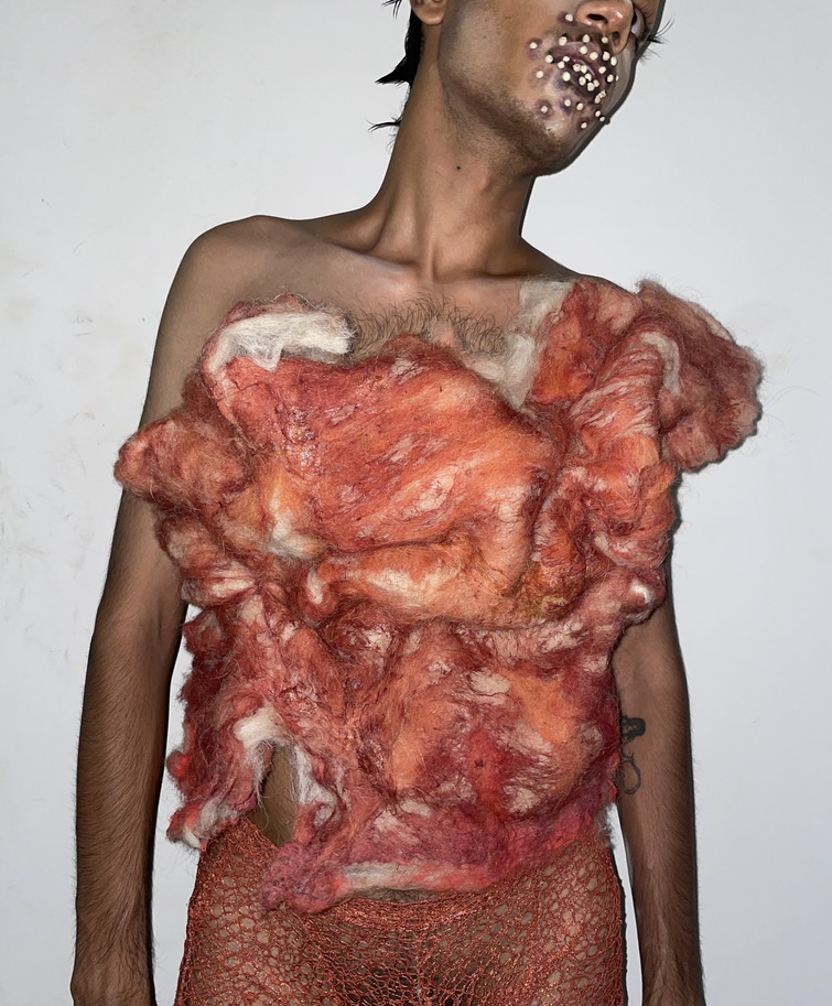 Identity is not polished—it is convulsing flesh, stitched with instinct and turmoil. Fabric here is no longer clothing but a second skin: raw, grotesque, animal, alive. These images voice the brutal honesty of being—where beauty bleeds into ugliness, and selfhood mutates into language. Fashion ceases to decorate; it wounds, clings, breathes. “Second Self-ness” is the flesh within—the convulsion of love, scars, and identity unmasked. Growing up a queer person in India, I lacked the media and outlet to express so I created a fabric to reflect the theme from felted raw Gujarat wool and hand dyed over time, since there is no better way of storytelling than wearing them.