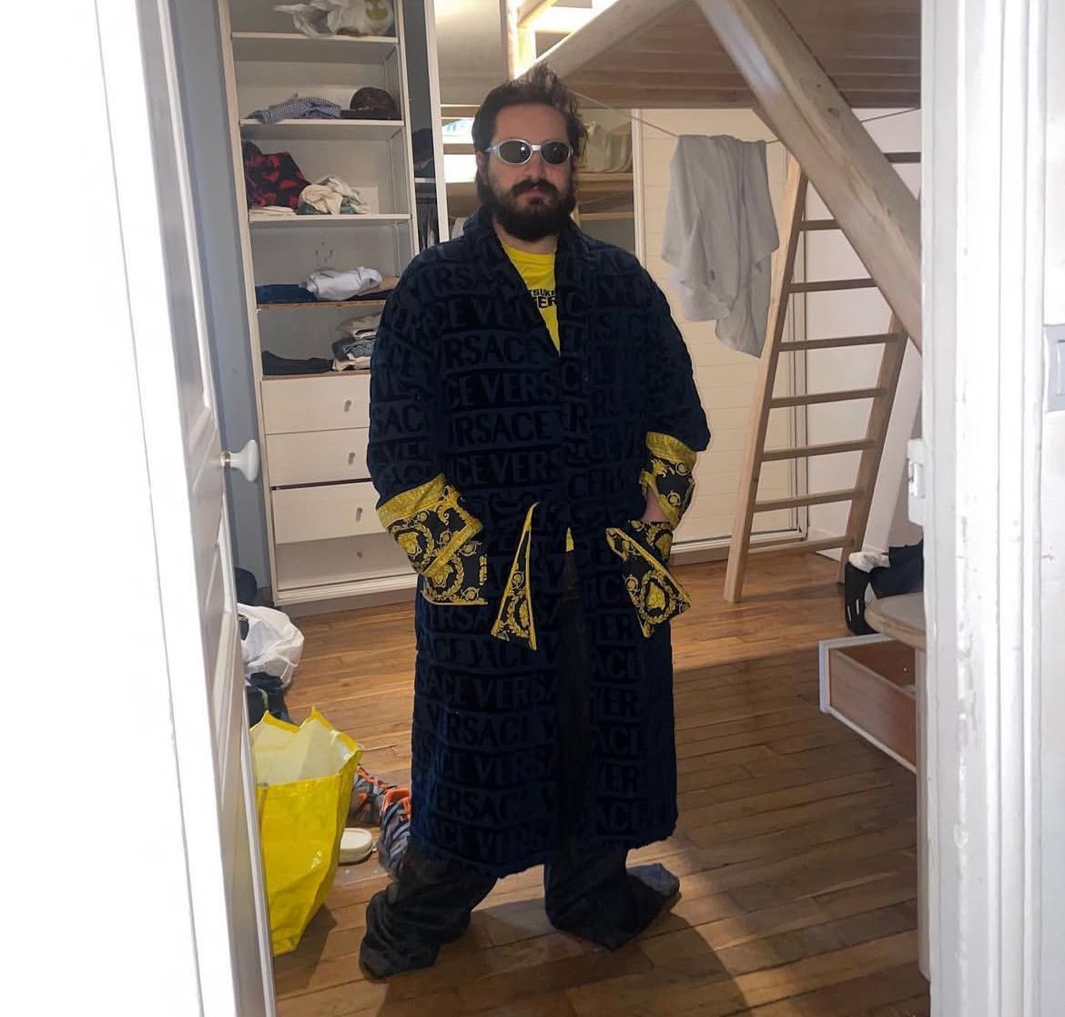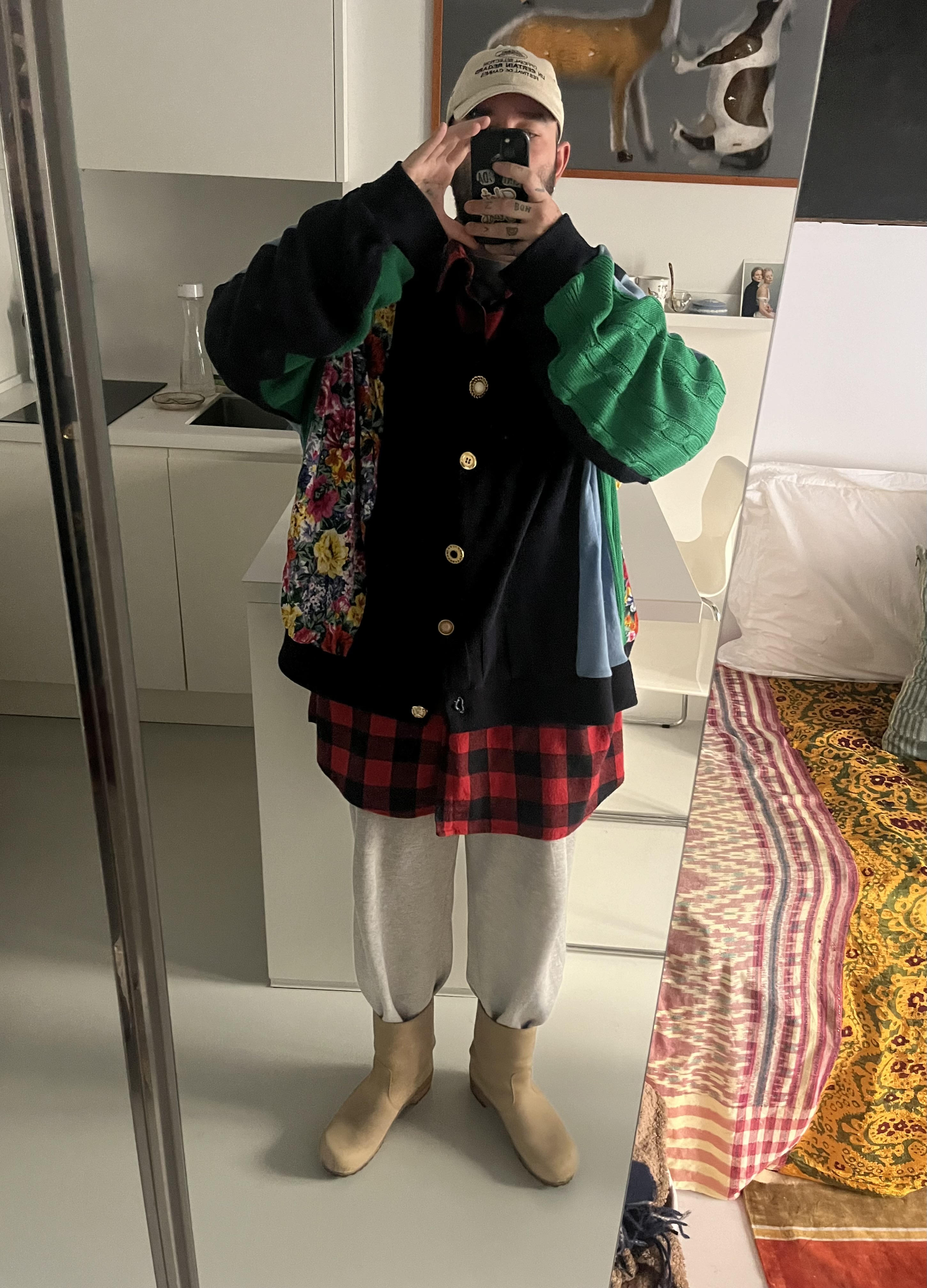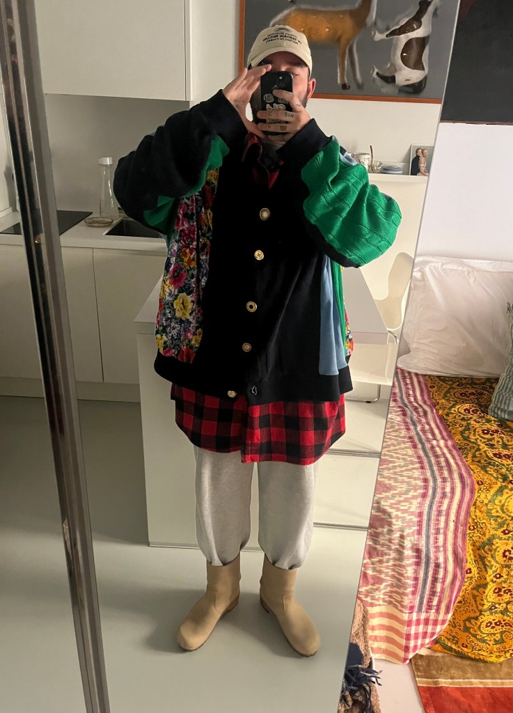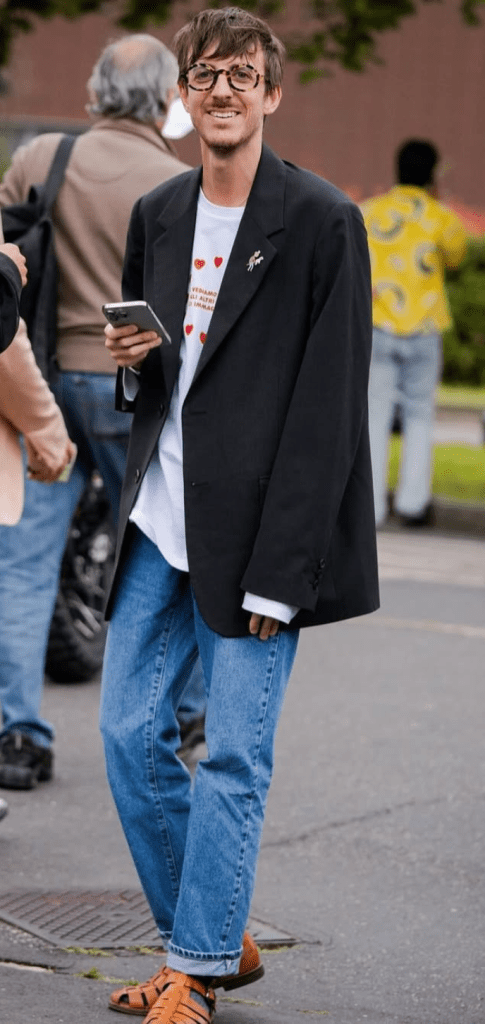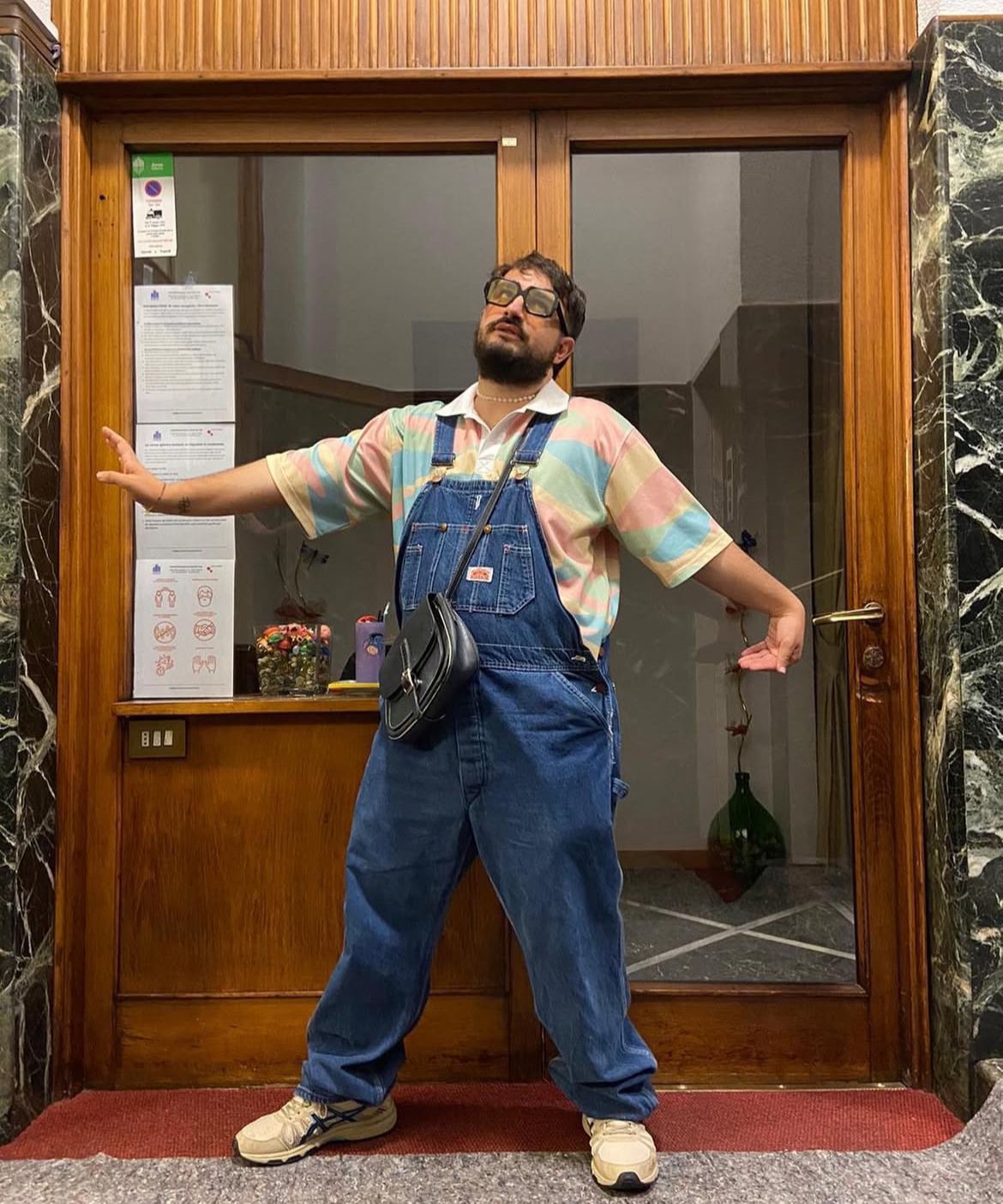 Non c’è qualcosa o qualcuno a cui mi ispiri, da che ho memoria vesto oversize, a volte al limite del talare. Cerco l’over sia nel formale che nel casual e, in base al grado di formalità dell’evento tendo a essere sempre più informale. Adam Sandler alleggia nel mio immaginario, ma non mi ispiro a nulla. Ma qualcuno si ispira veramente a qualcosa per uscire? Vorrei avere il tempo di ispirarmi ma ne ho poco e mi vesto pressoché uguale ogni giorno.