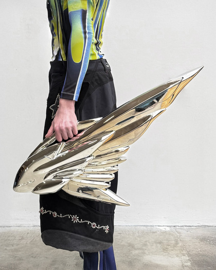 A bridge between analogue memory and a digital future, presenting the garments as future relics—part protection, part mythology. In envisioning clothing as evolving bodies, the designer aims to challenge conventional notions of fashion and invite viewers to reconsider the relationship between clothing and identity.